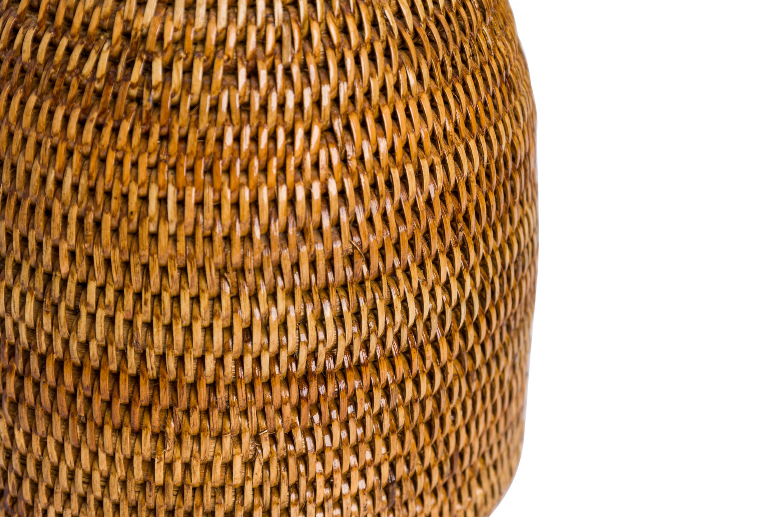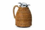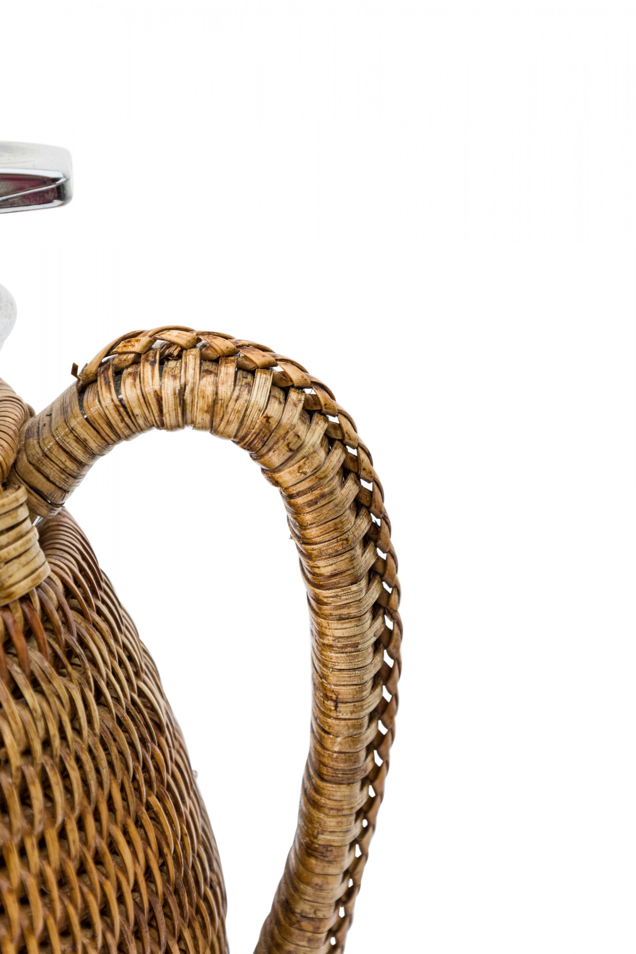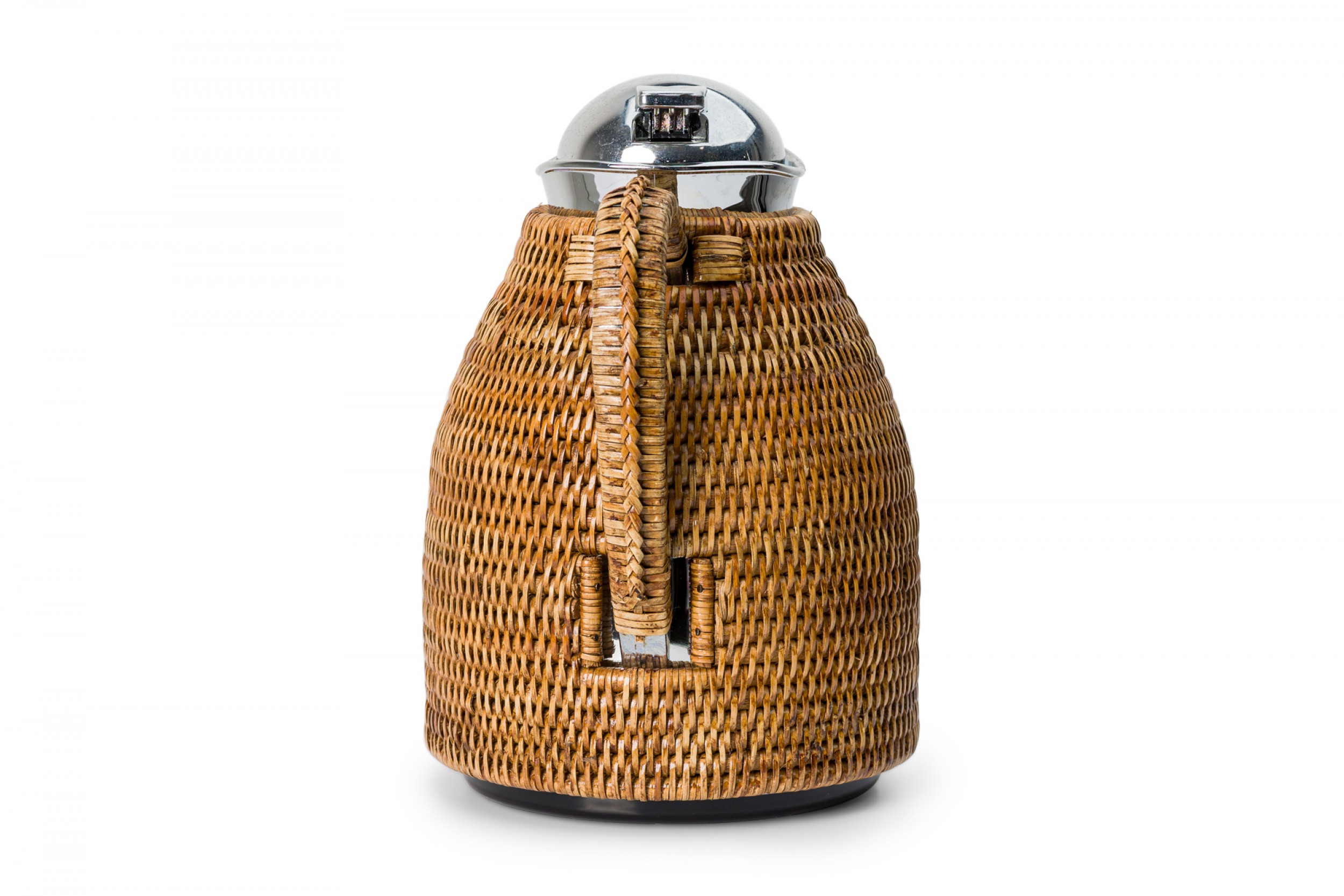 Vintage German Mid-Century hot beverage carafe / pitcher with a silver body and interior encased in a tightly woven brown wicker decorative exterior, with a sealable top.