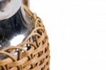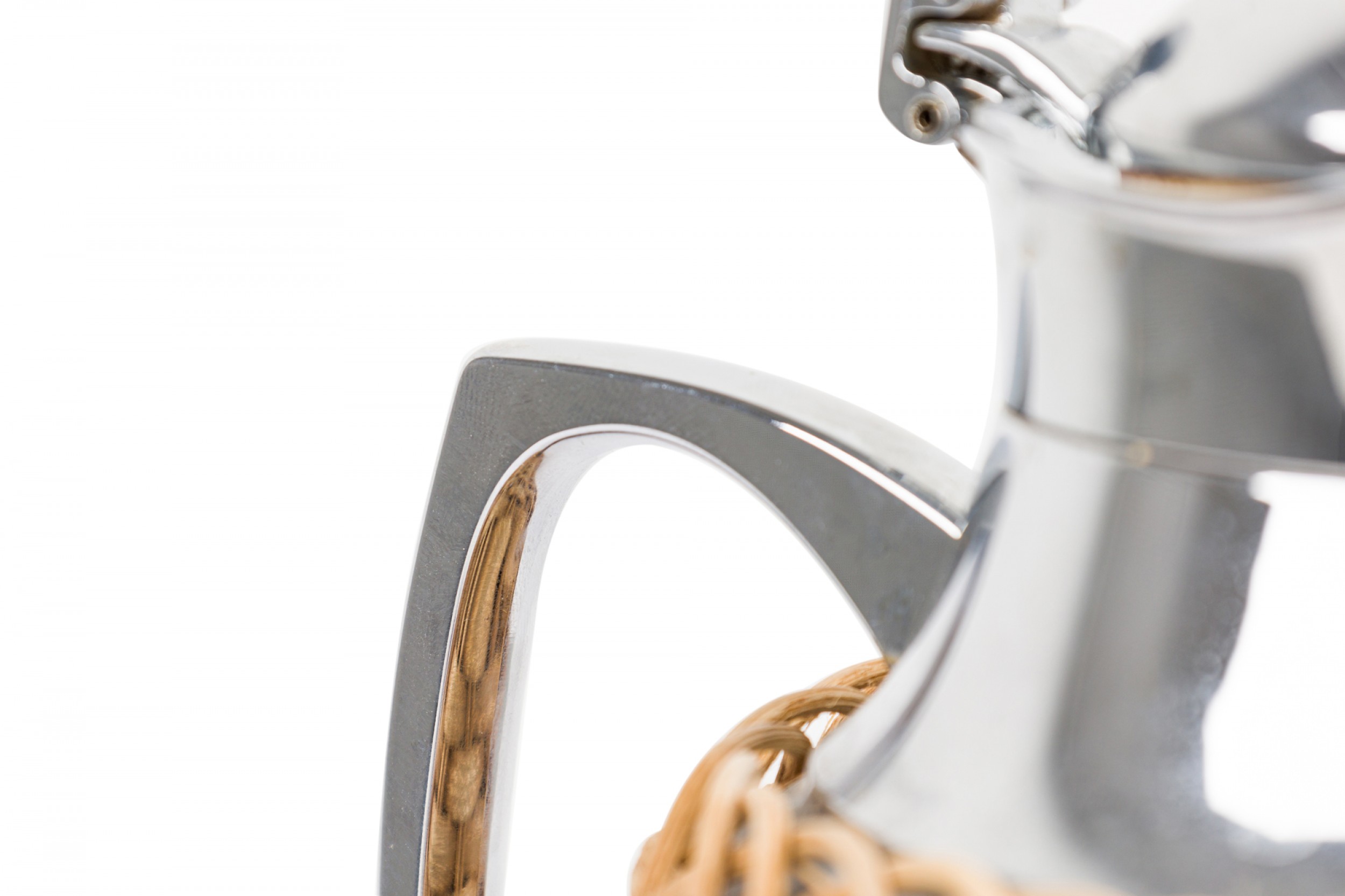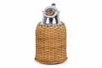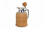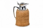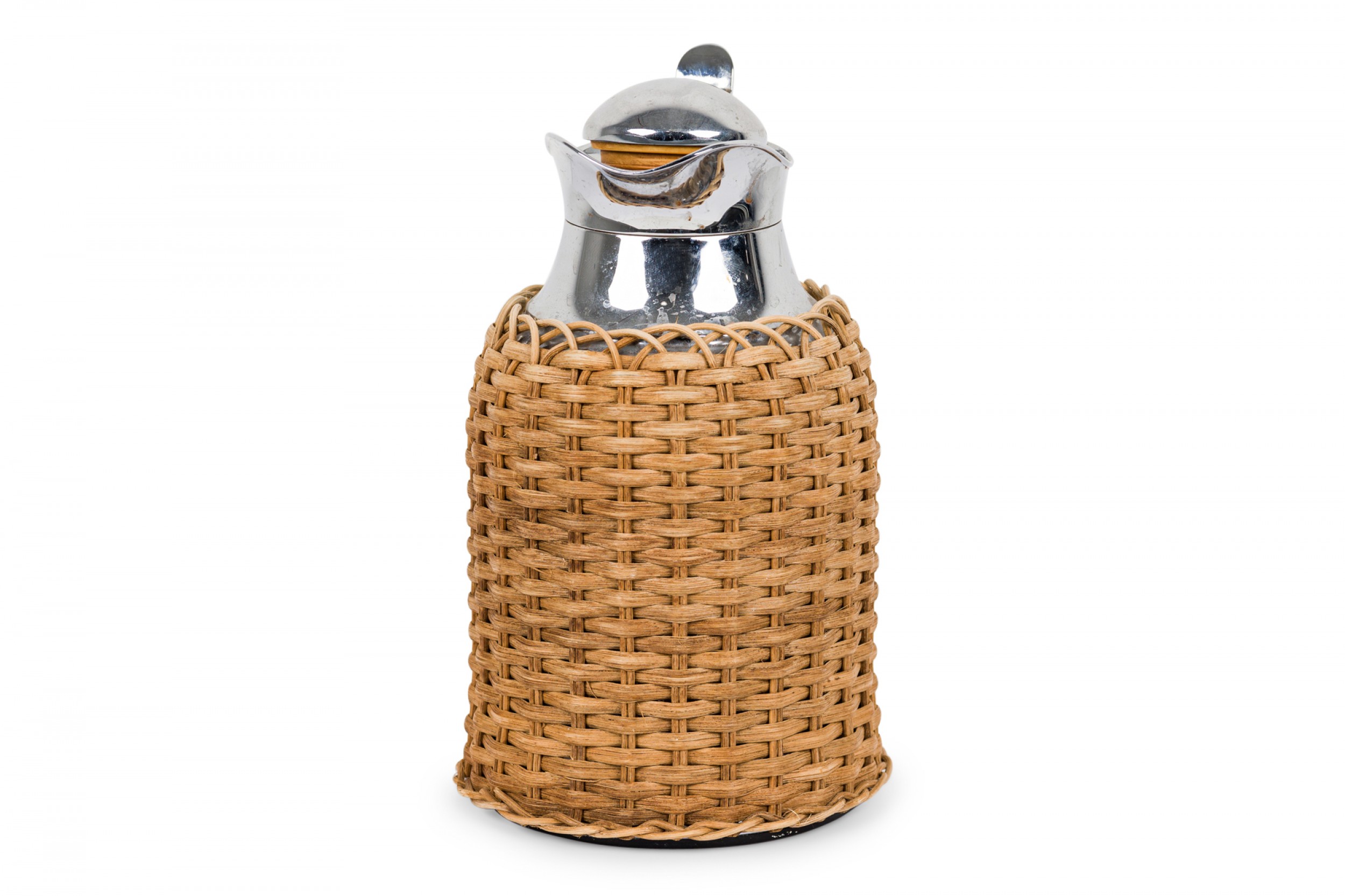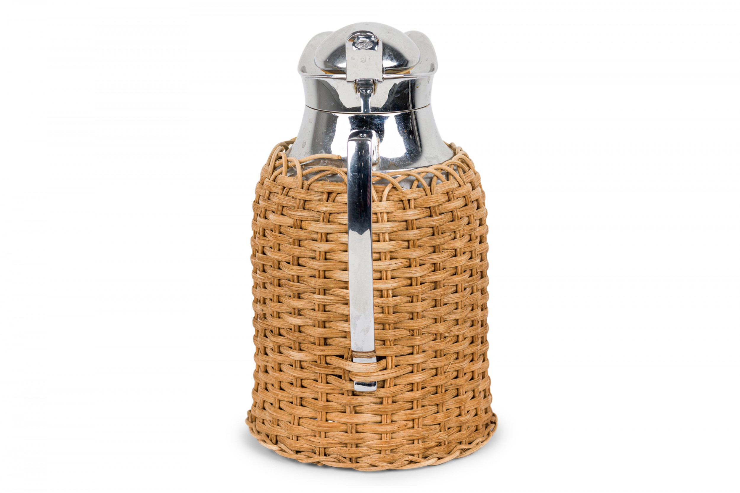 Vintage German hot beverage carafe / pitcher with a silver body and interior encased in a tightly woven brown wicker decorative exterior, with a sealable top.
