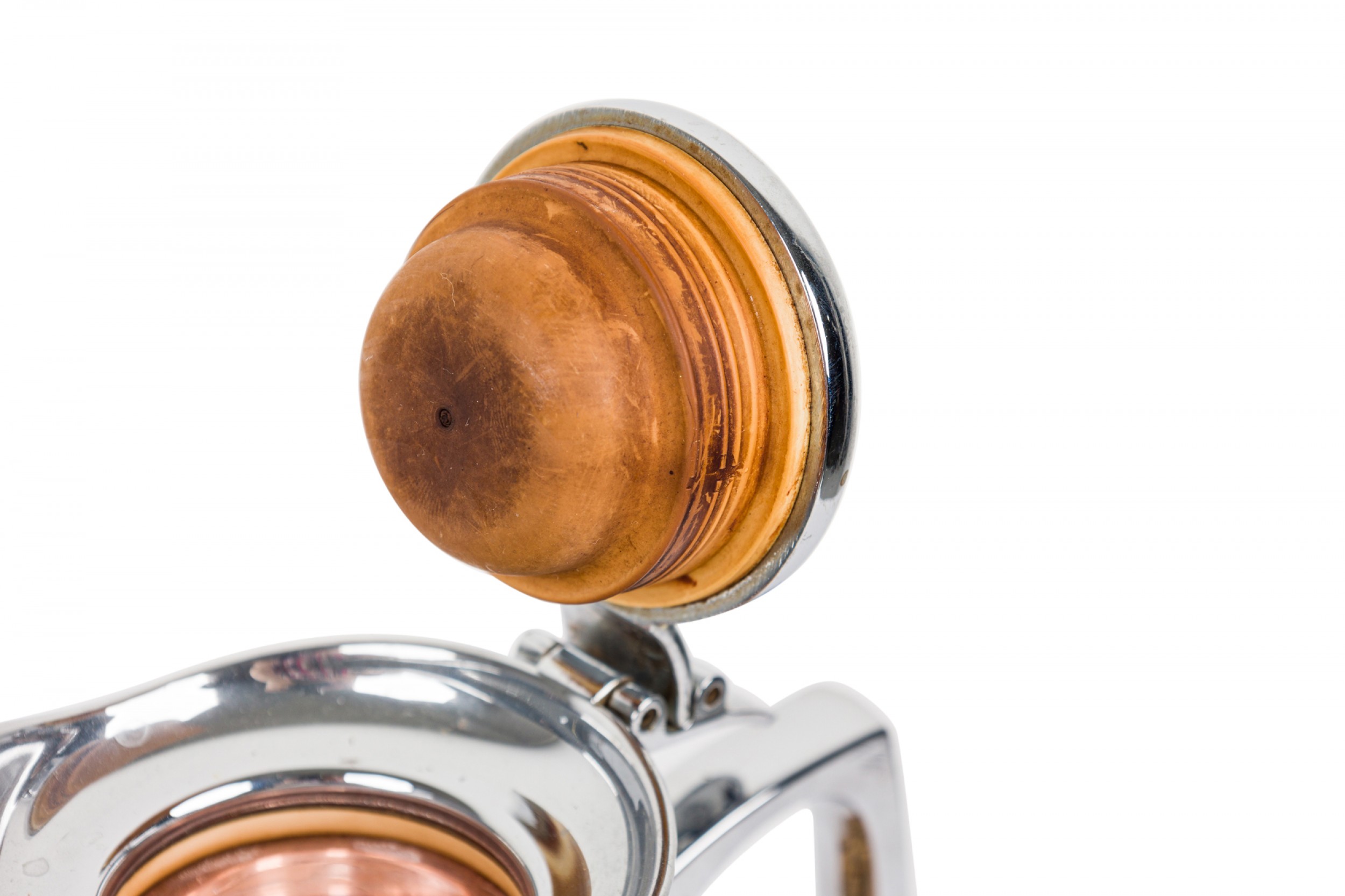 Vintage German hot beverage carafe / pitcher with a silver body and interior encased in a tightly woven brown wicker decorative exterior, with a sealable top..