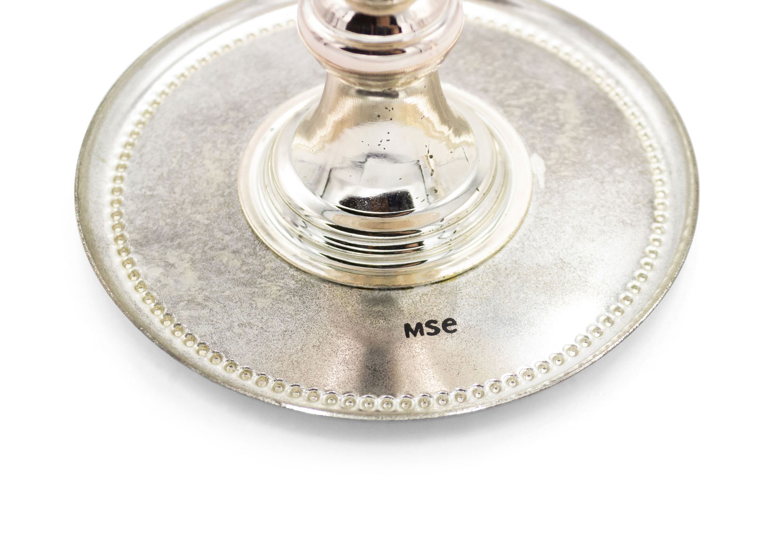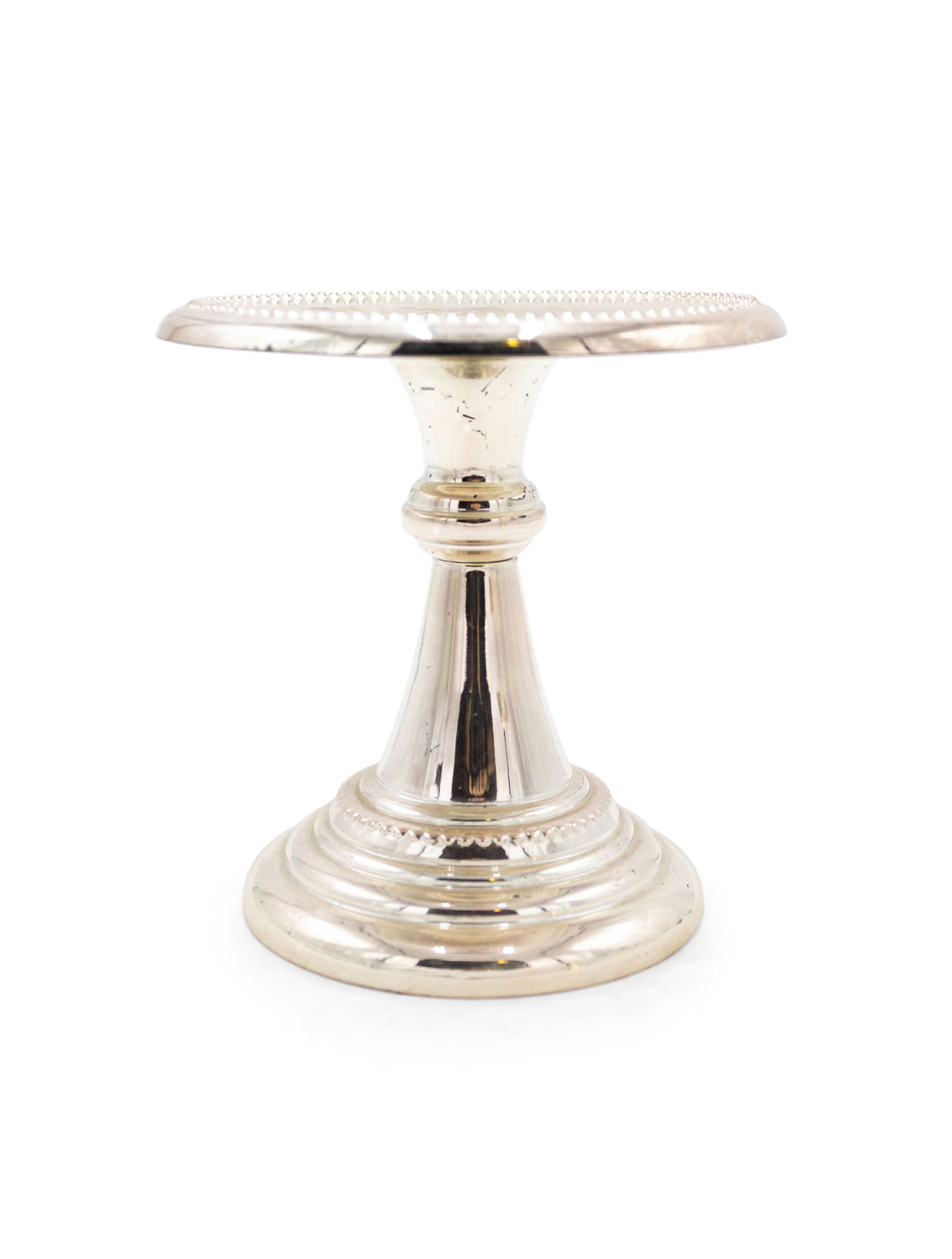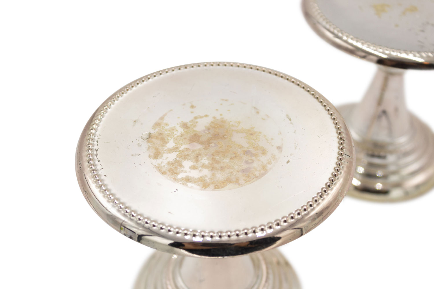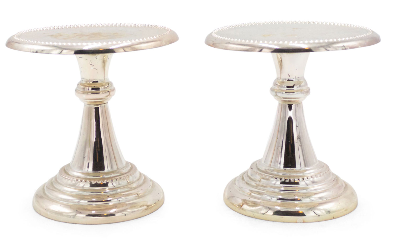 PAIR of vintage silver metal candlesticks with a round tapered tiered base and flat top surface (PRICED AS PAIR)..