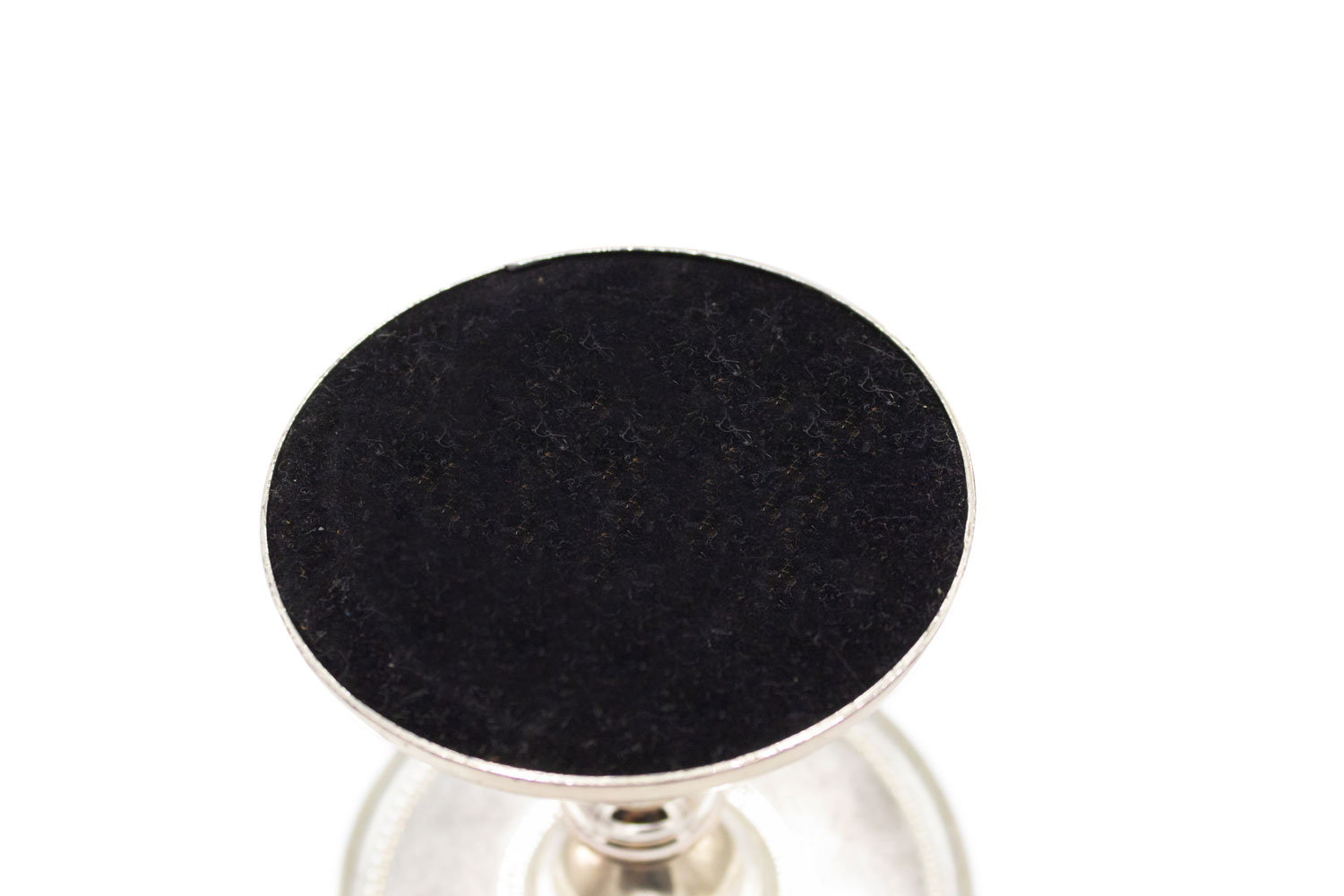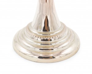 PAIR of vintage silver metal candlesticks with a round tapered tiered base and flat top surface (PRICED AS PAIR).