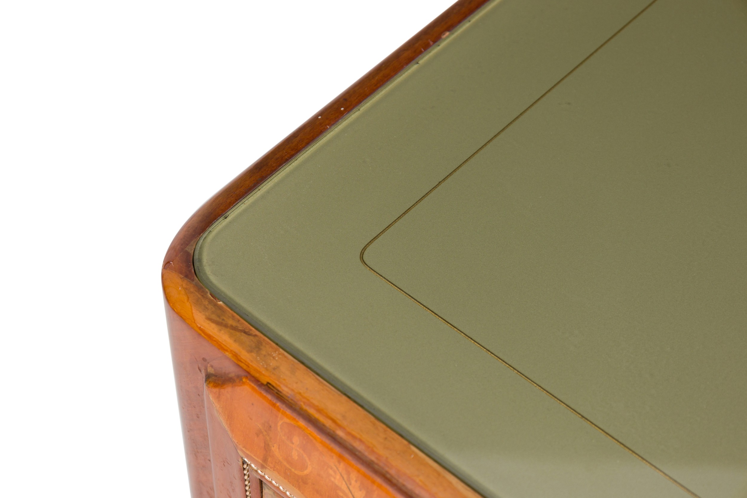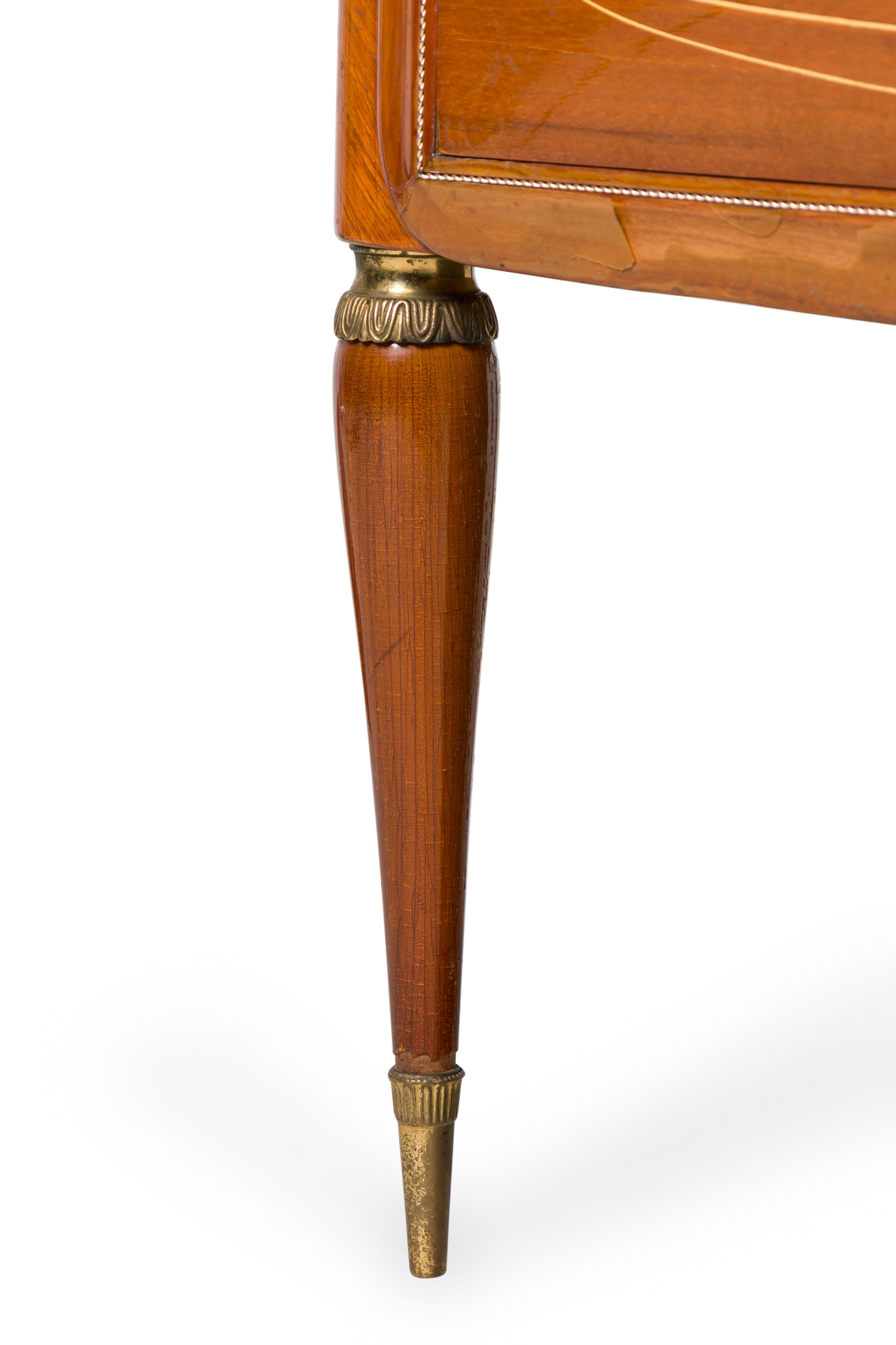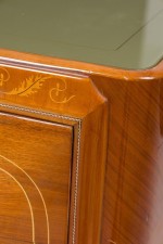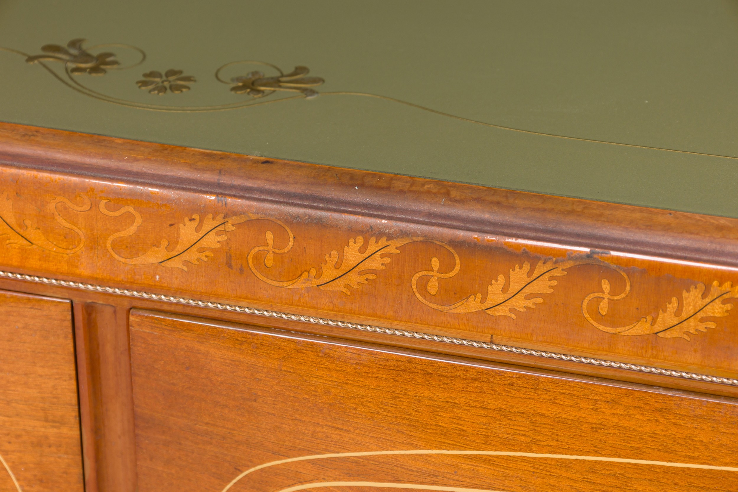 Italian Mid-Century Modern (1950s) mahogany and fruitwood sideboard / buffet with 2 pair of drawers having an oval sunburst veneer design with inlaid banding and a floral top edge and an inset green and gilt decorated glass top resting on four tapered round legs with bronze trim (VITTORIO DASSI)