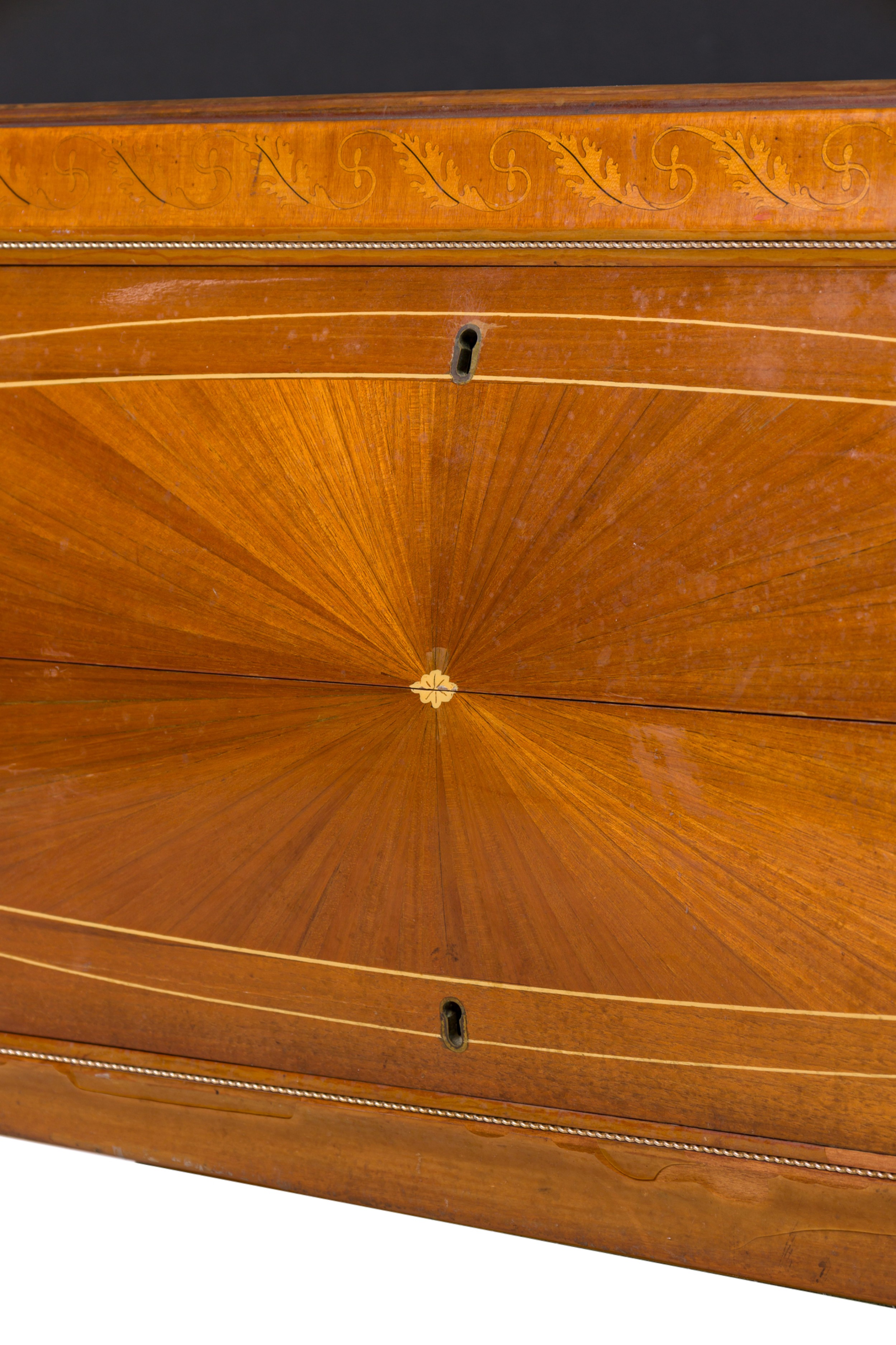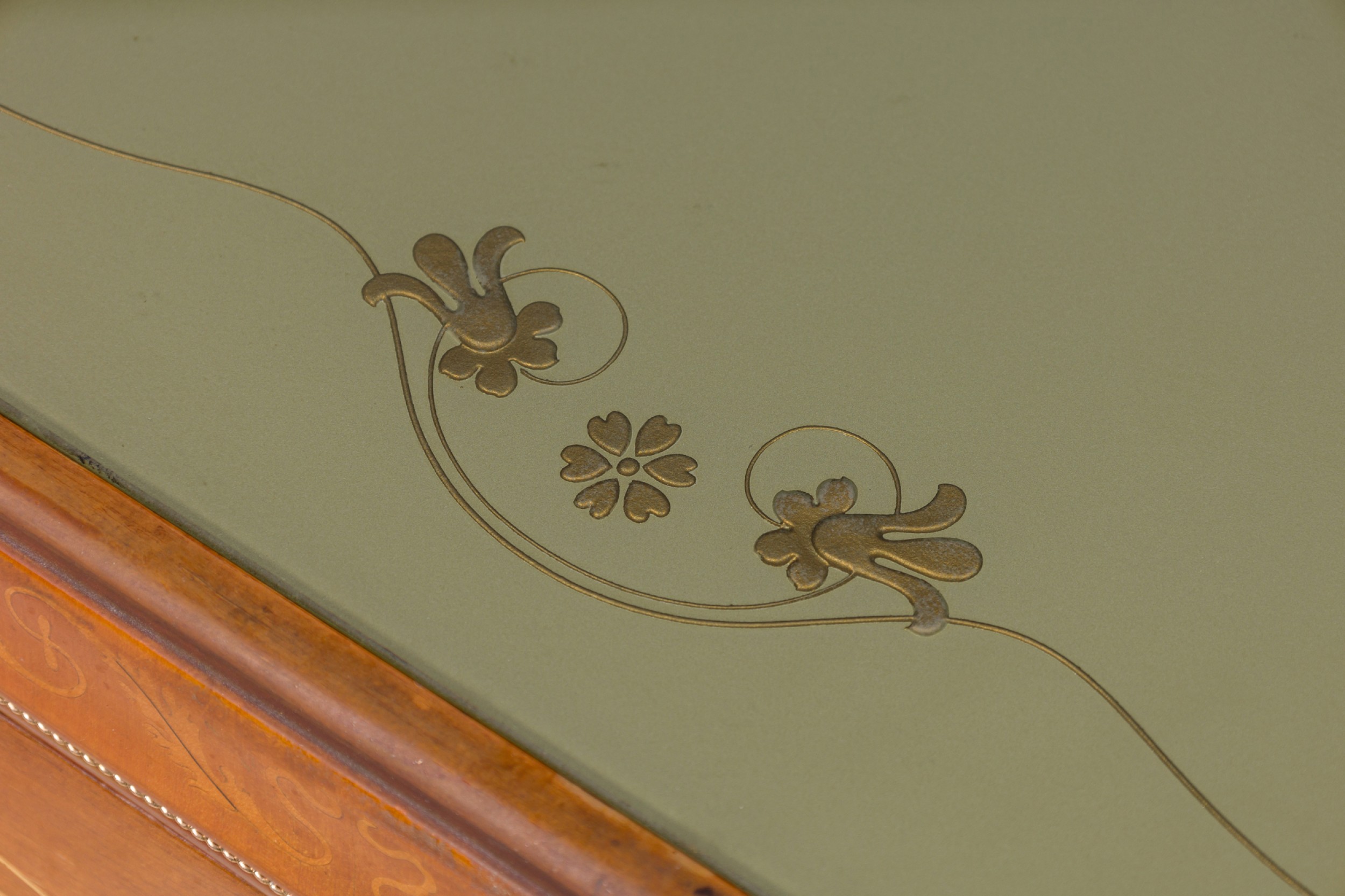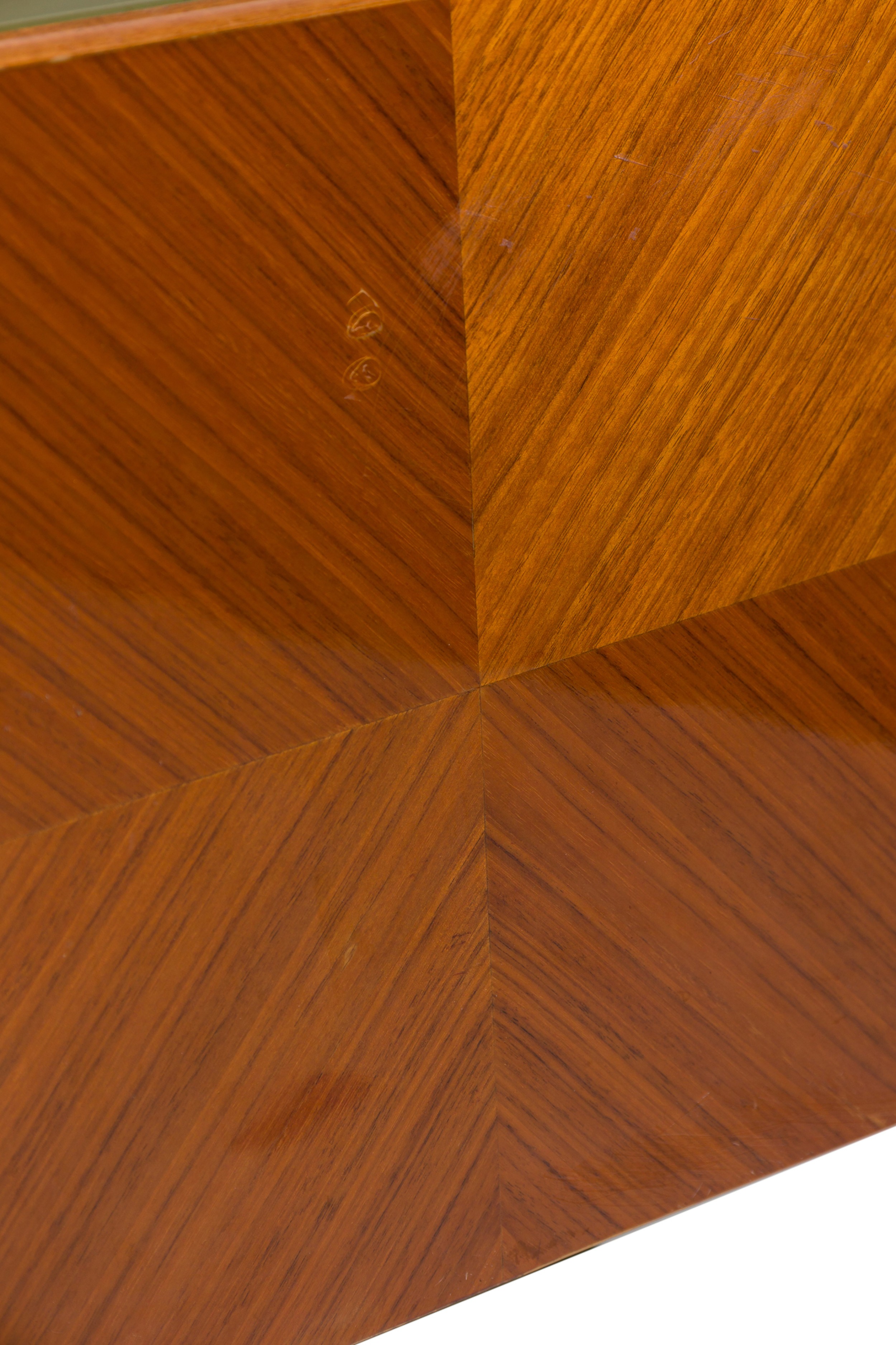 Italian Mid-Century Modern (1950s) mahogany and fruitwood sideboard / buffet with 2 pair of drawers having an oval sunburst veneer design with inlaid banding and a floral top edge and an inset green and gilt decorated glass top resting on four tapered round legs with bronze trim (VITTORIO DASSI)