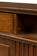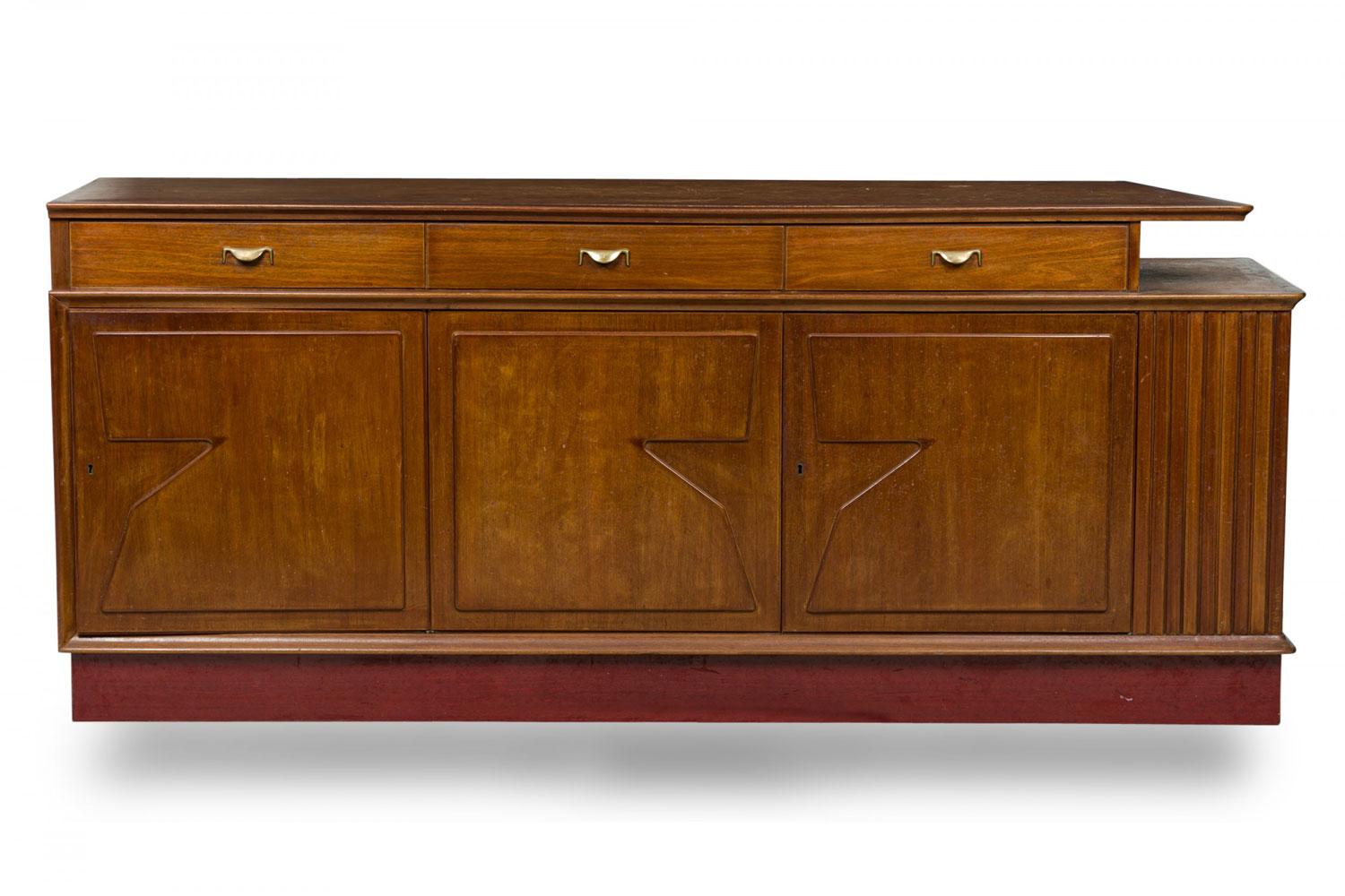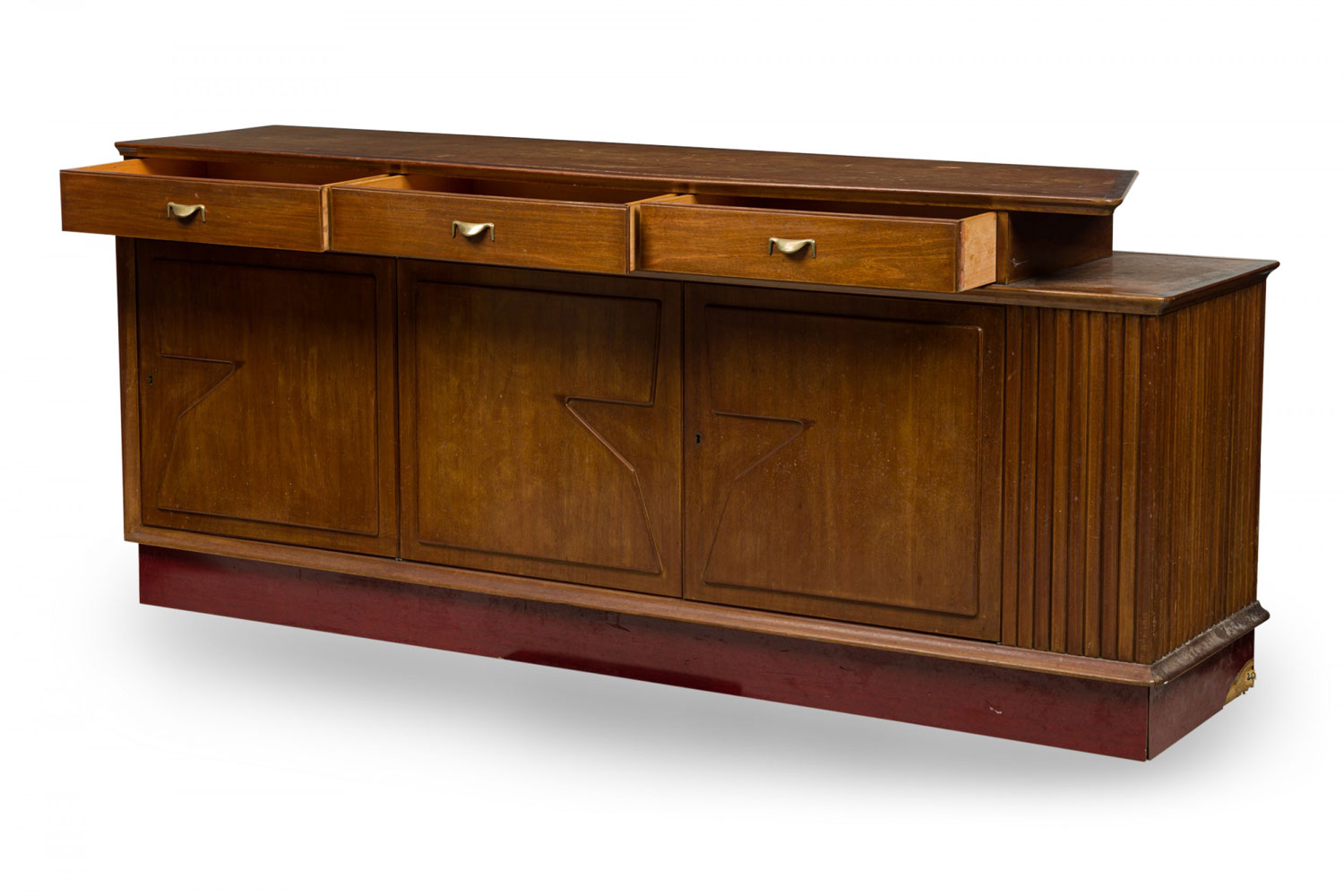 Mid-Century Italian Modern buffet / room divider / credenza with a walnut case featuring three upper drawers with brass drawer pulls over three hinged cabinets with decorative geometric cutouts. (VITTORIO DASSI)