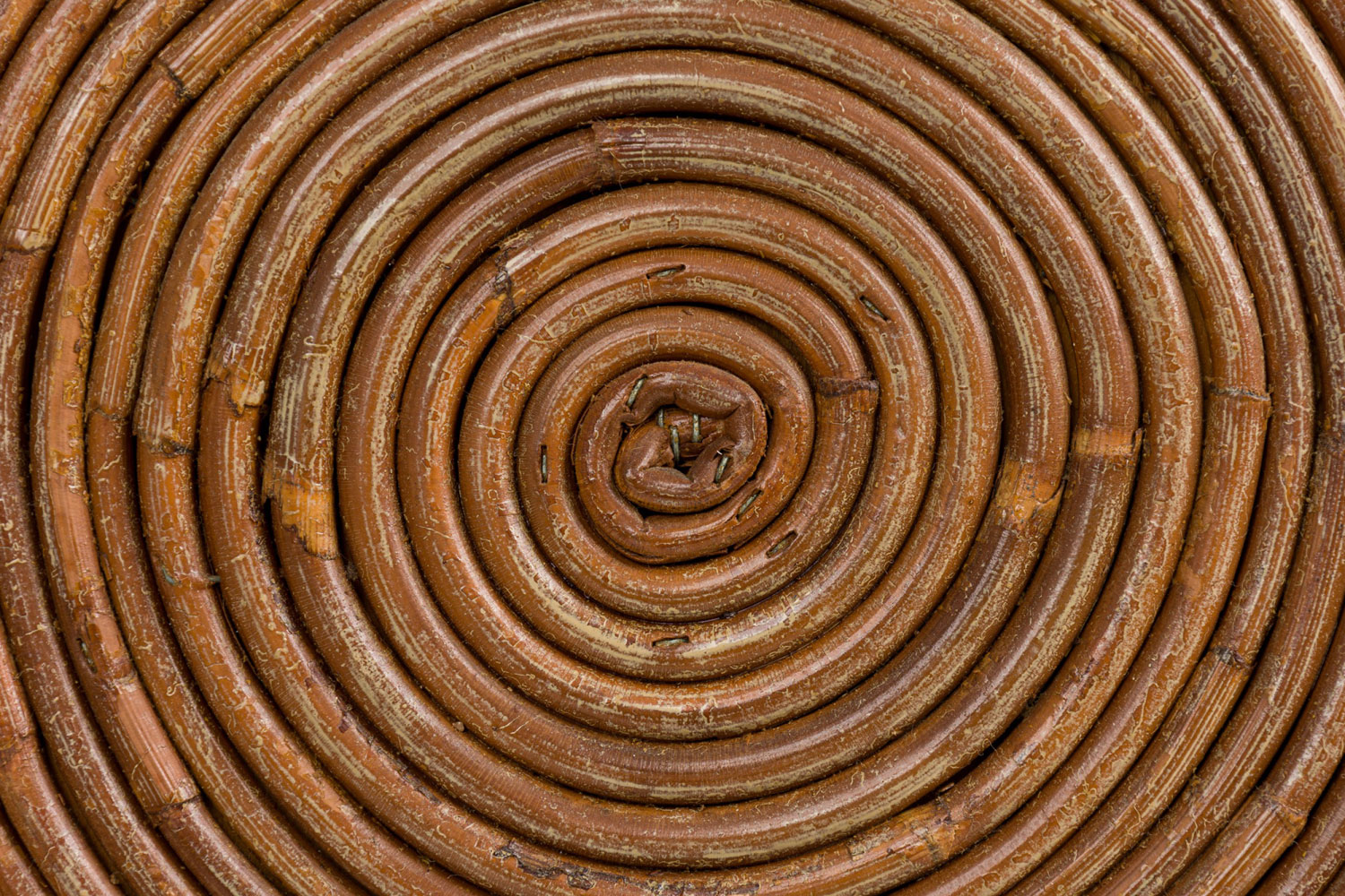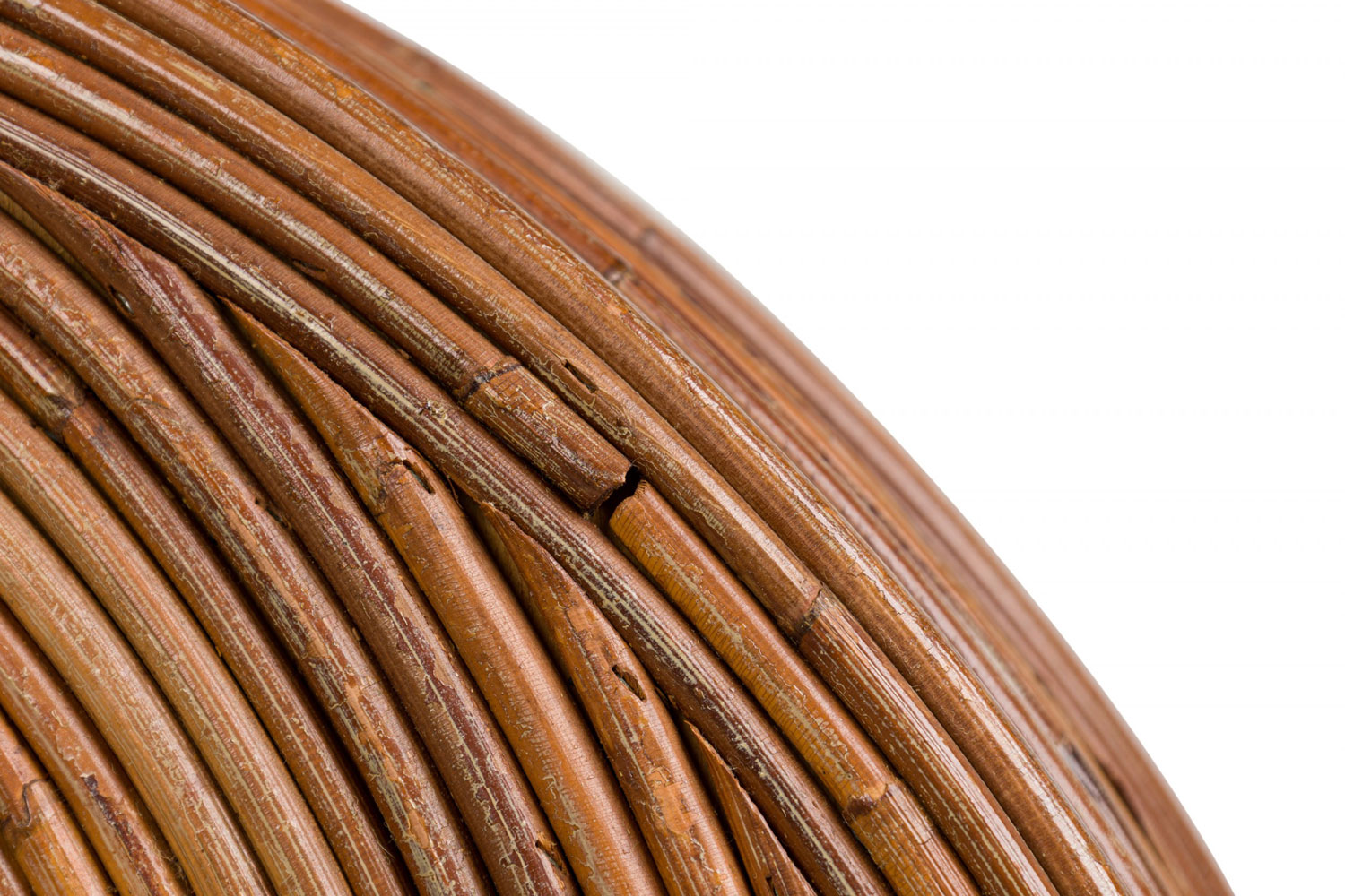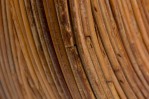 Mid-Century (1970s) Italian table lamp composed of pencil reed in a tapered circular form with extended brass stem and light switch socket, resting on a flattened bottom with an inset wood base. (VIVAI DEL SUD)