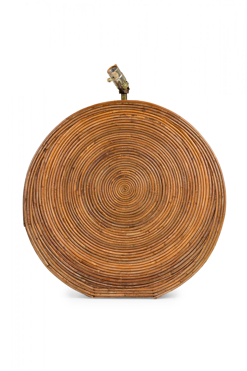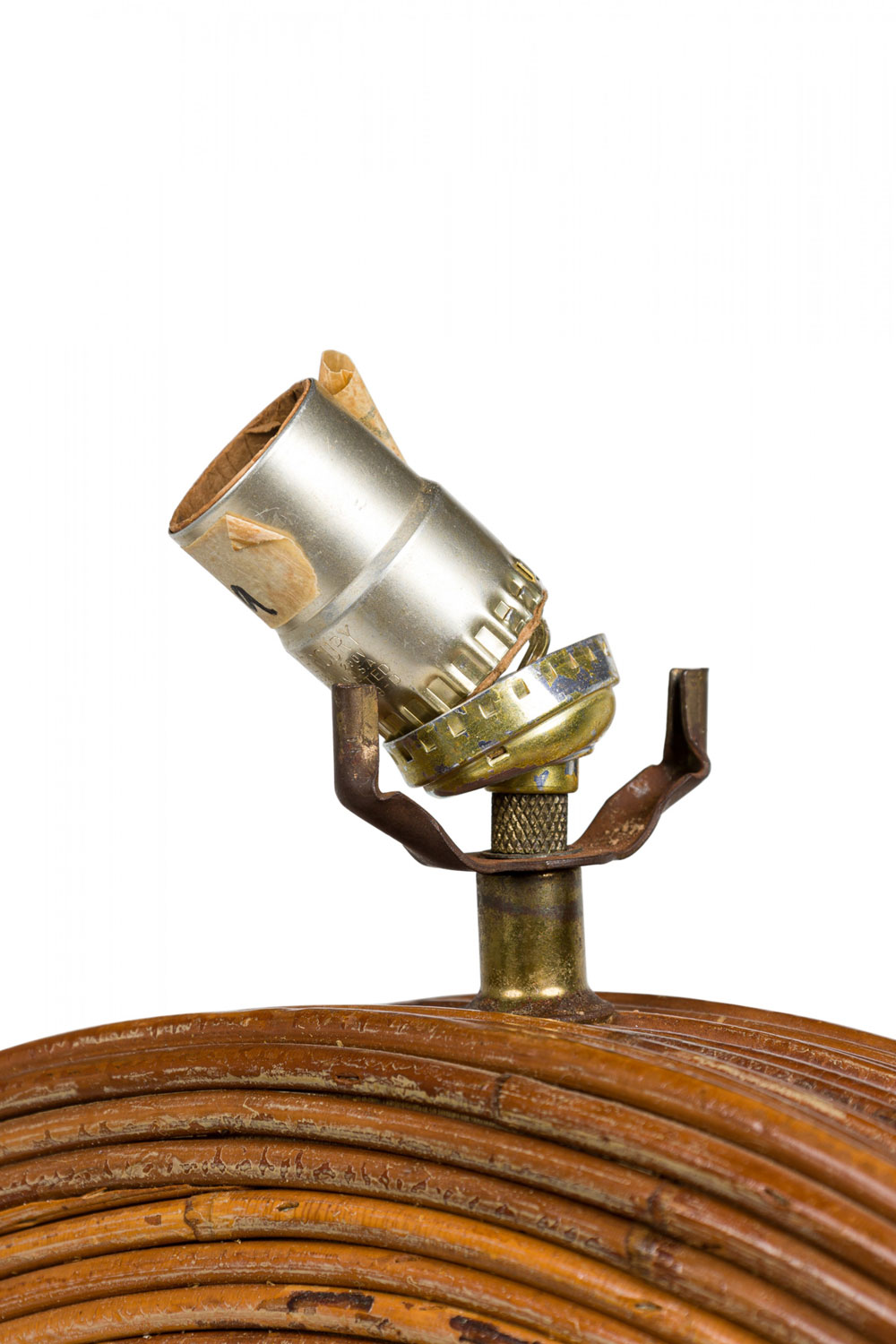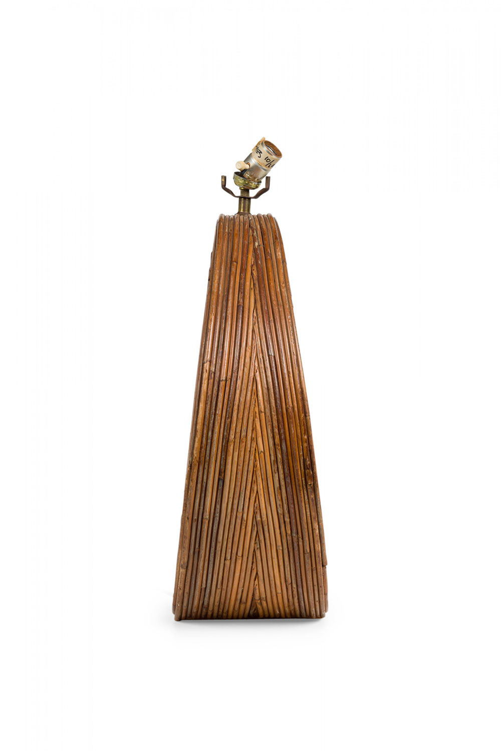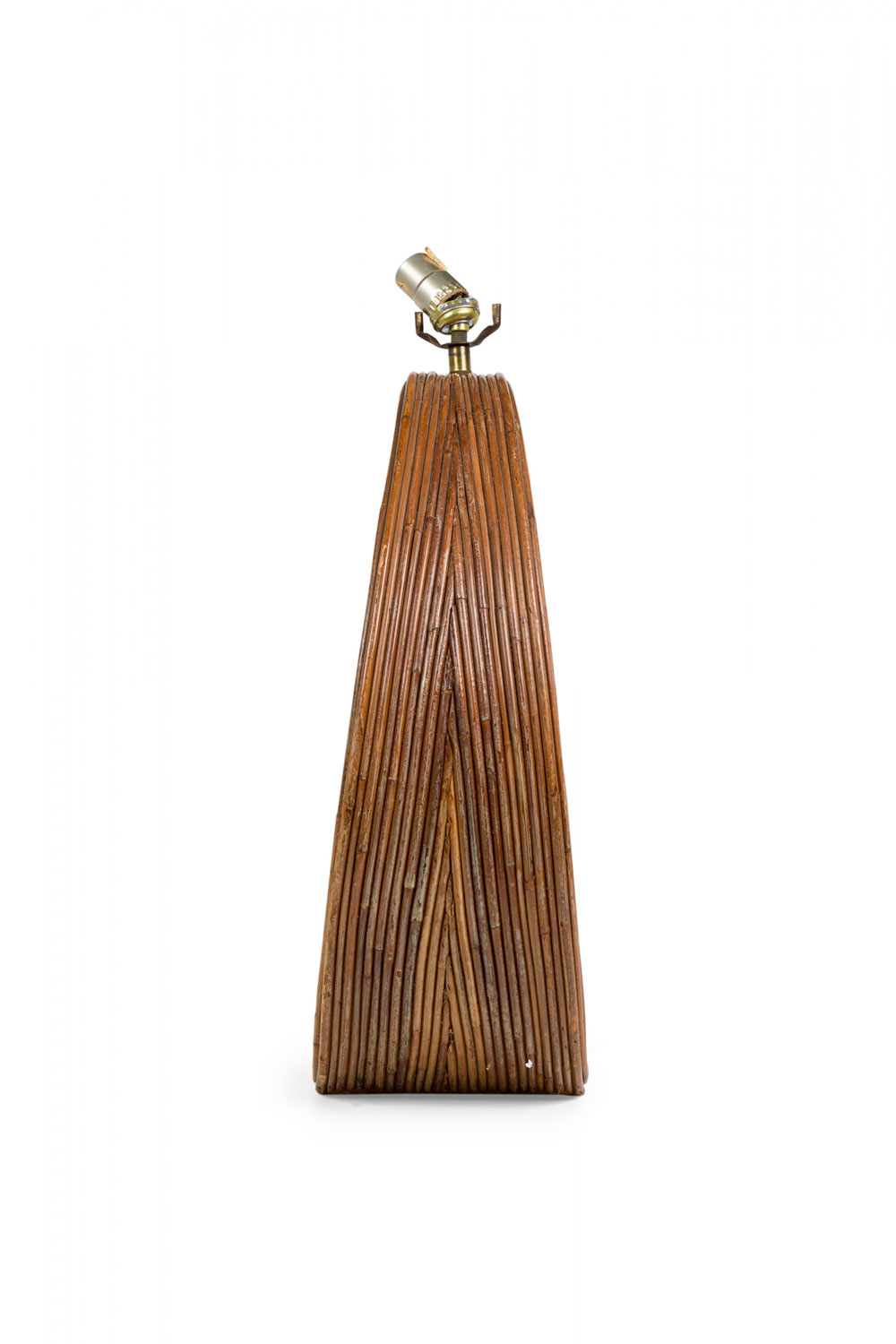 Mid-Century (1970s) Italian table lamp composed of pencil reed in a tapered circular form with extended brass stem and light switch socket, resting on a flattened bottom with an inset wood base. (VIVAI DEL SUD).
