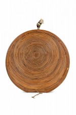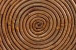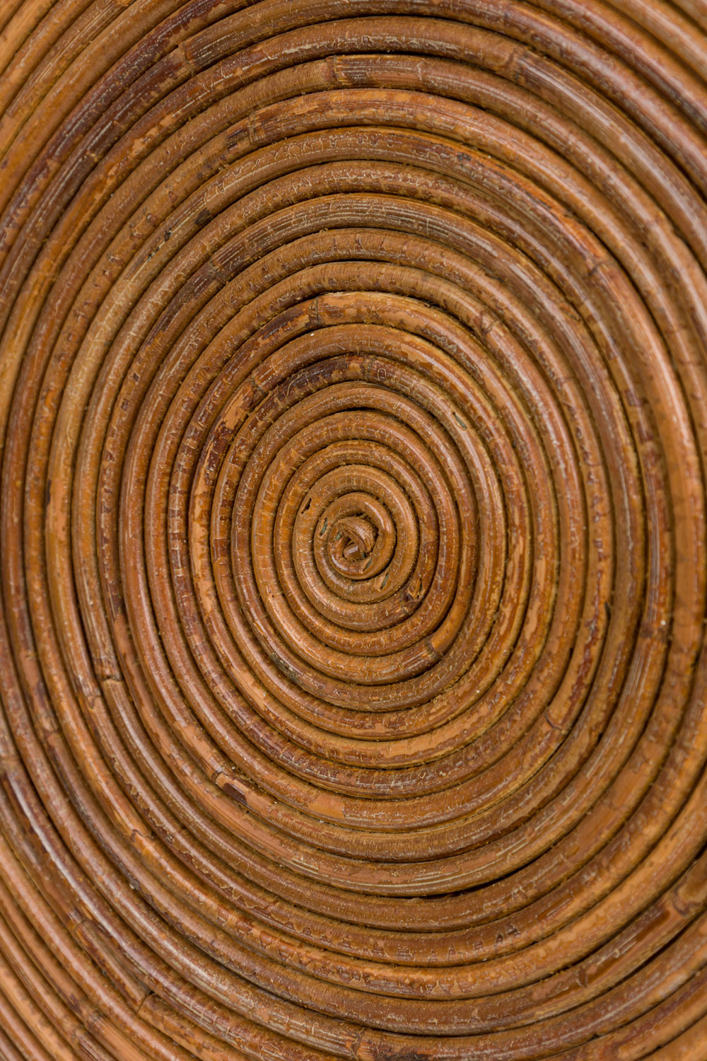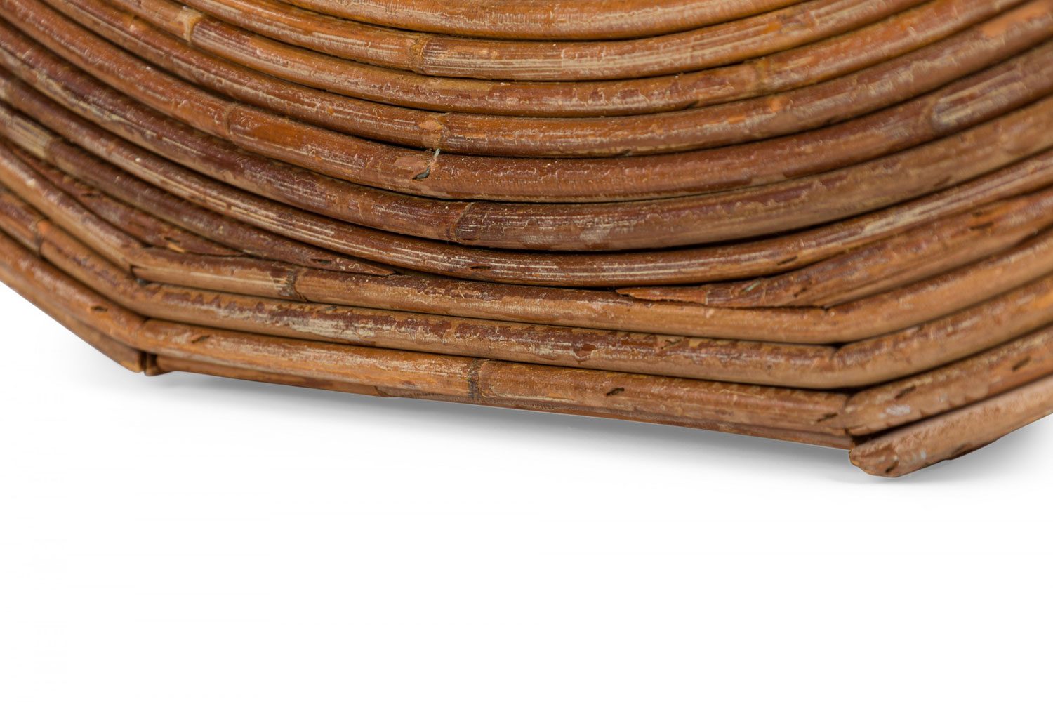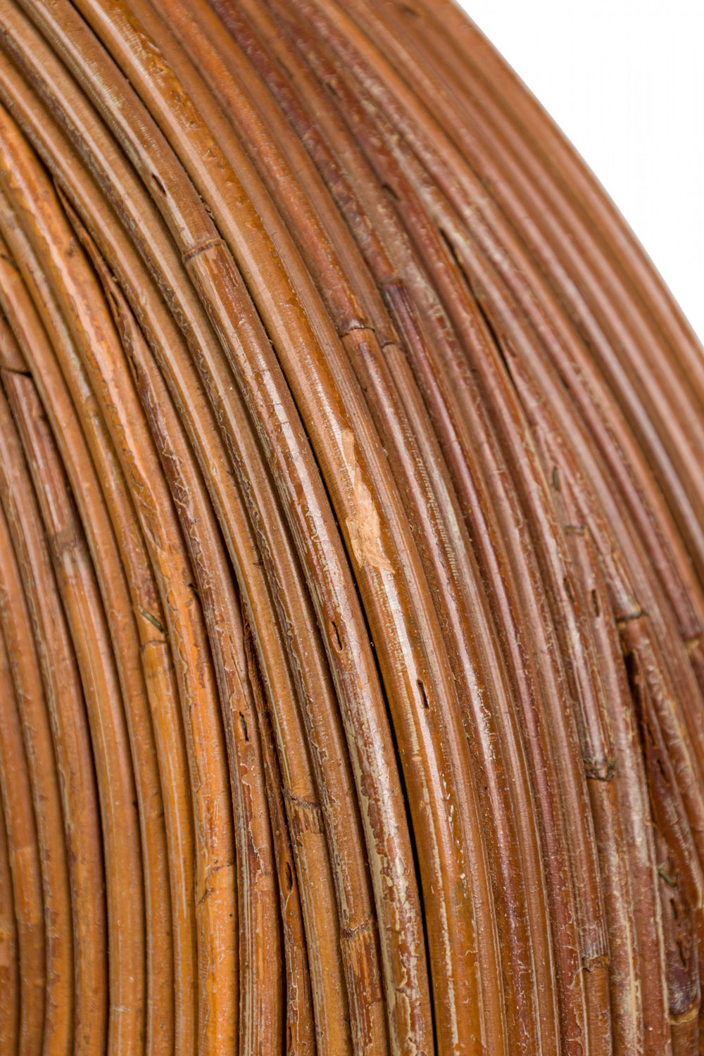 Mid-Century (1970s) Italian table lamp composed of pencil reed in a tapered circular form with extended brass stem and light switch socket, resting on a flattened bottom with an inset wood base. (VIVAI DEL SUD).