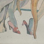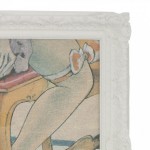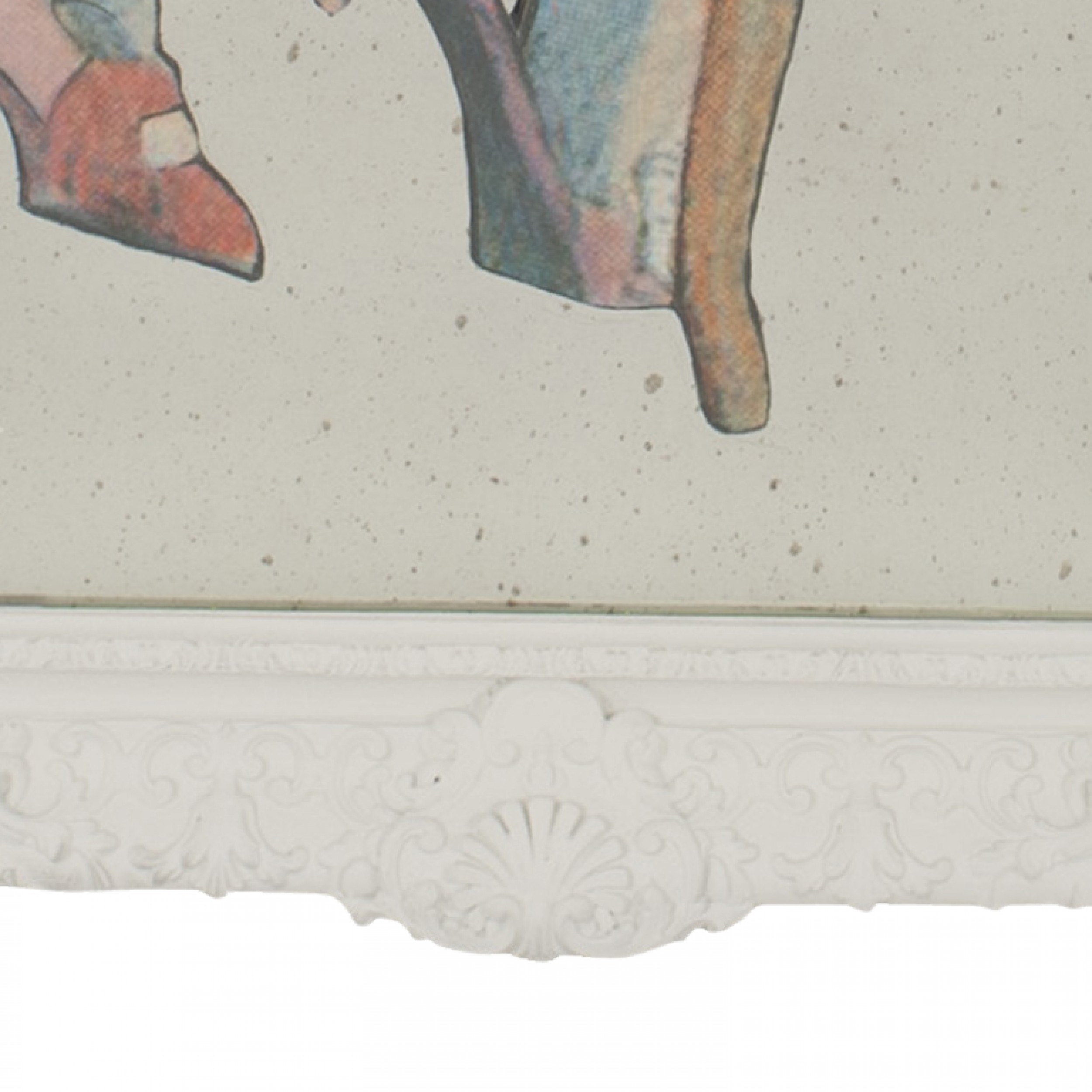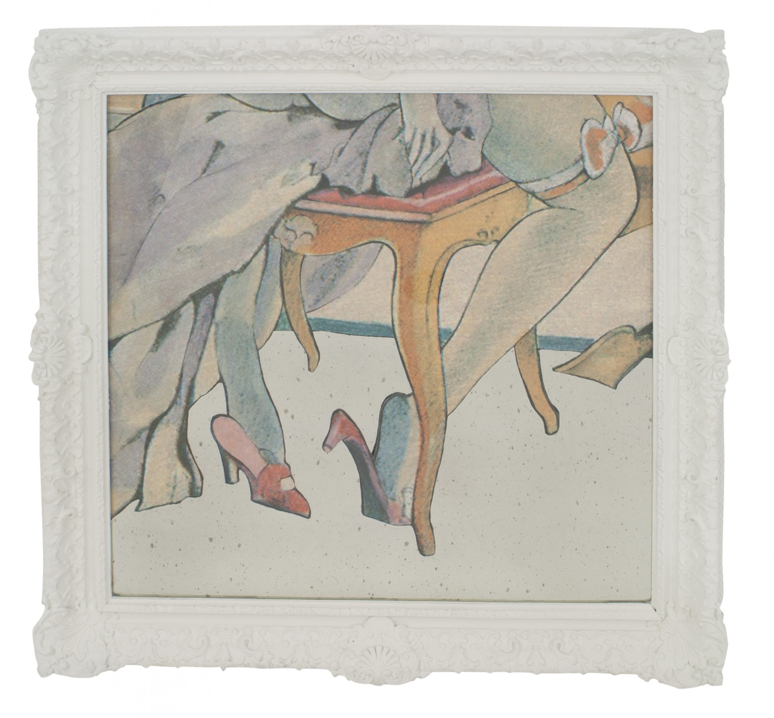 Contemporary reverse printed & painted on glass & mirror multi-colored stylized scene in a white lacquered carved frame (VOYEURISM & VANITY "SHOES", 2012, by GEOFFREY BRADFIELD)