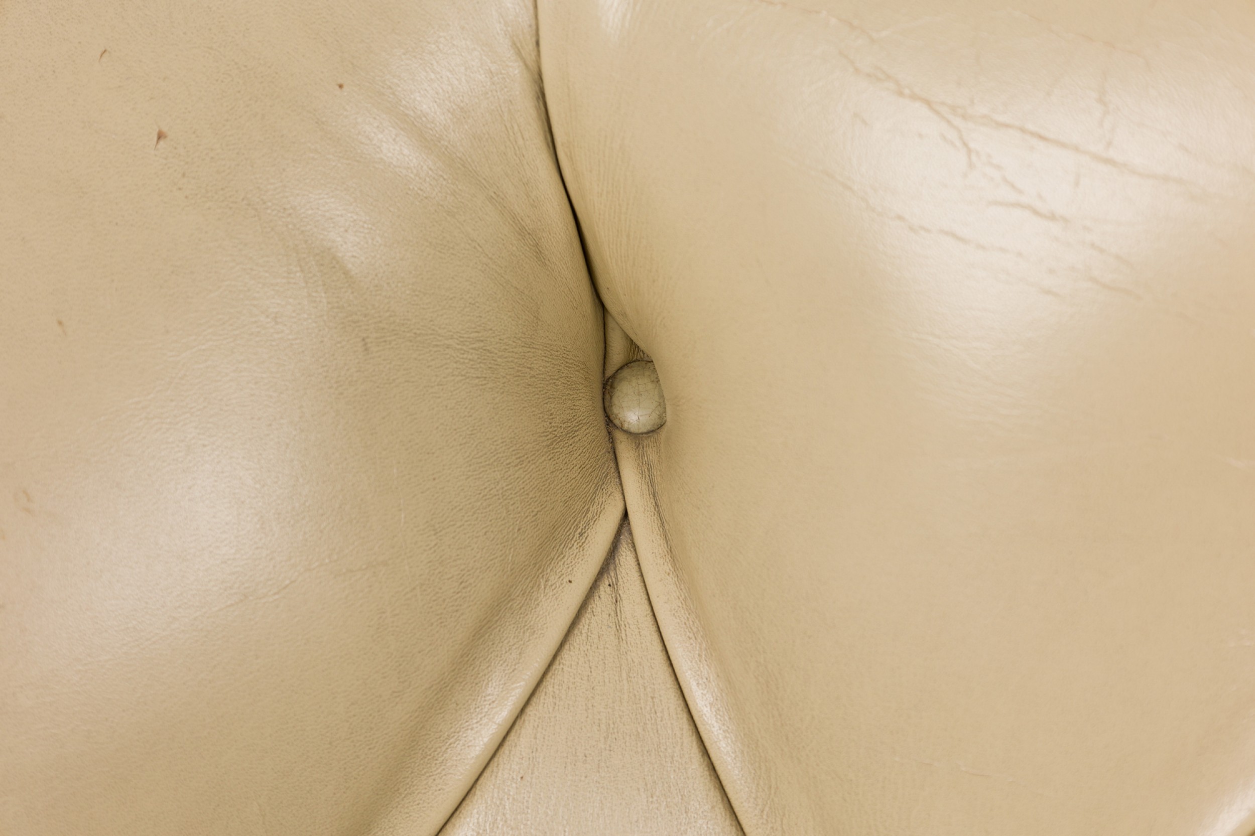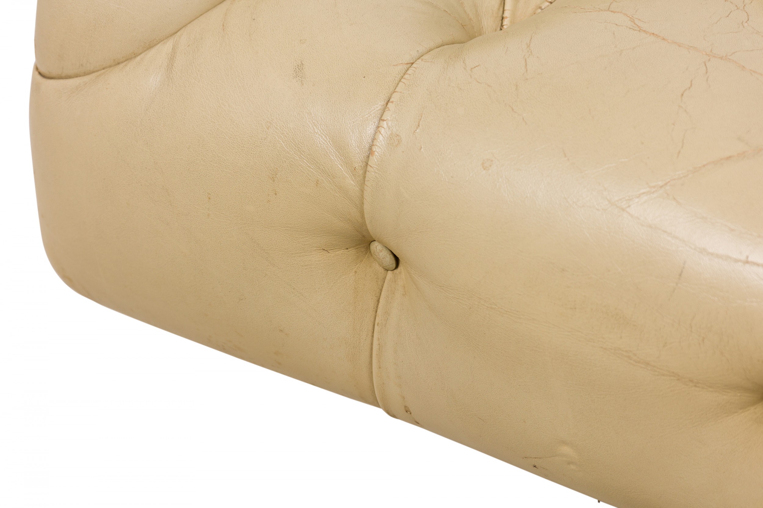 American Mid-Century tub-form swiveling lounge / armchair with beige button tufted leather upholstery, resting on a four leg brushed chrome pedestal base. (WARD BENNETT).