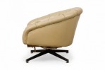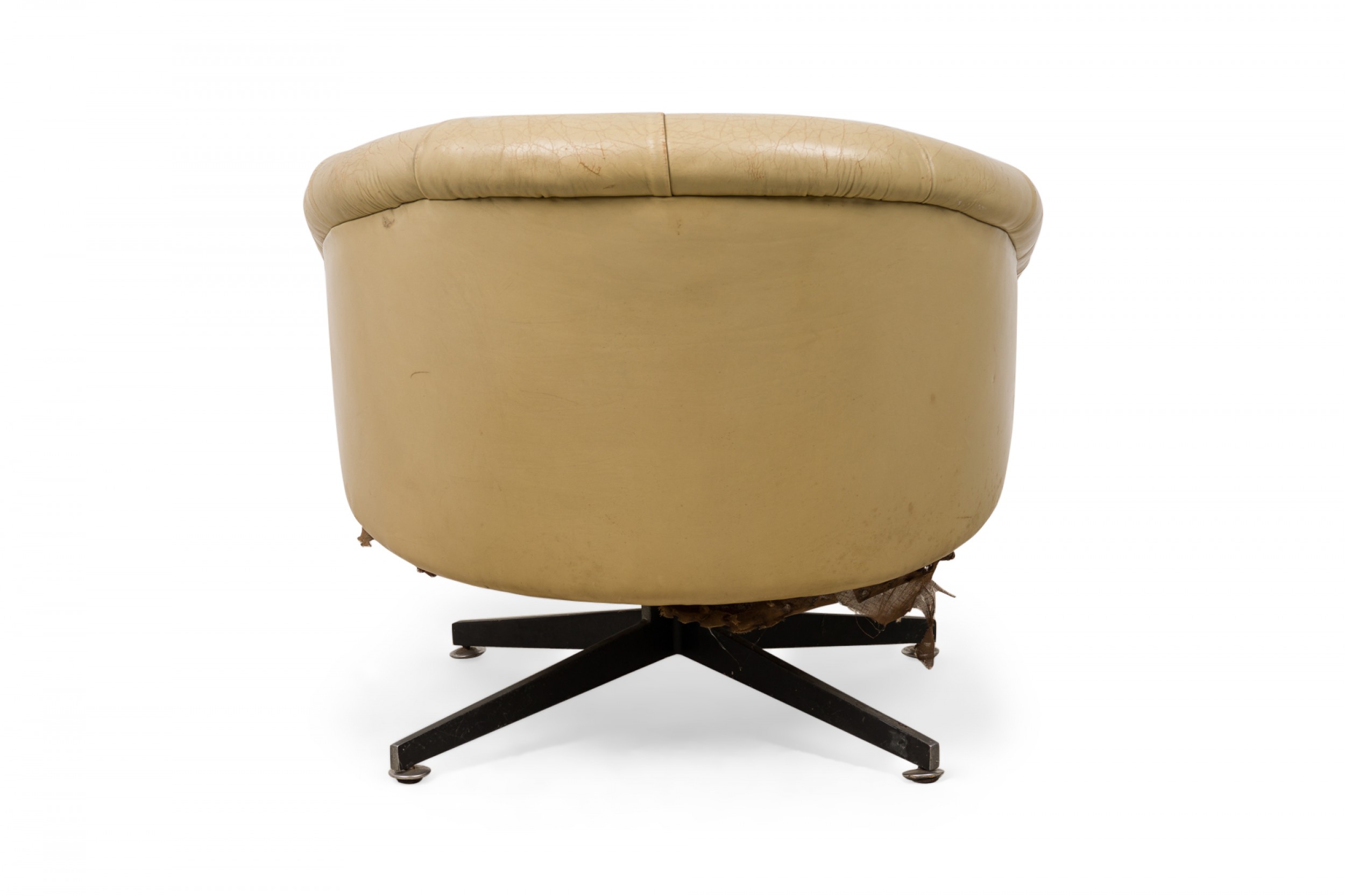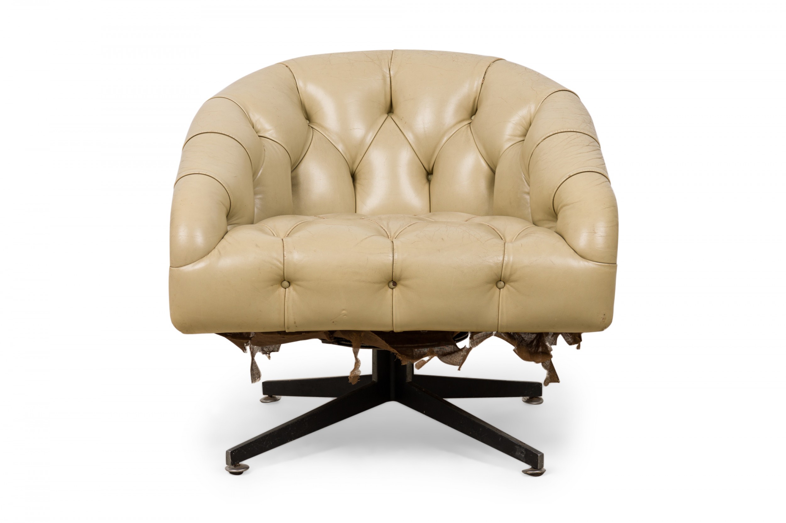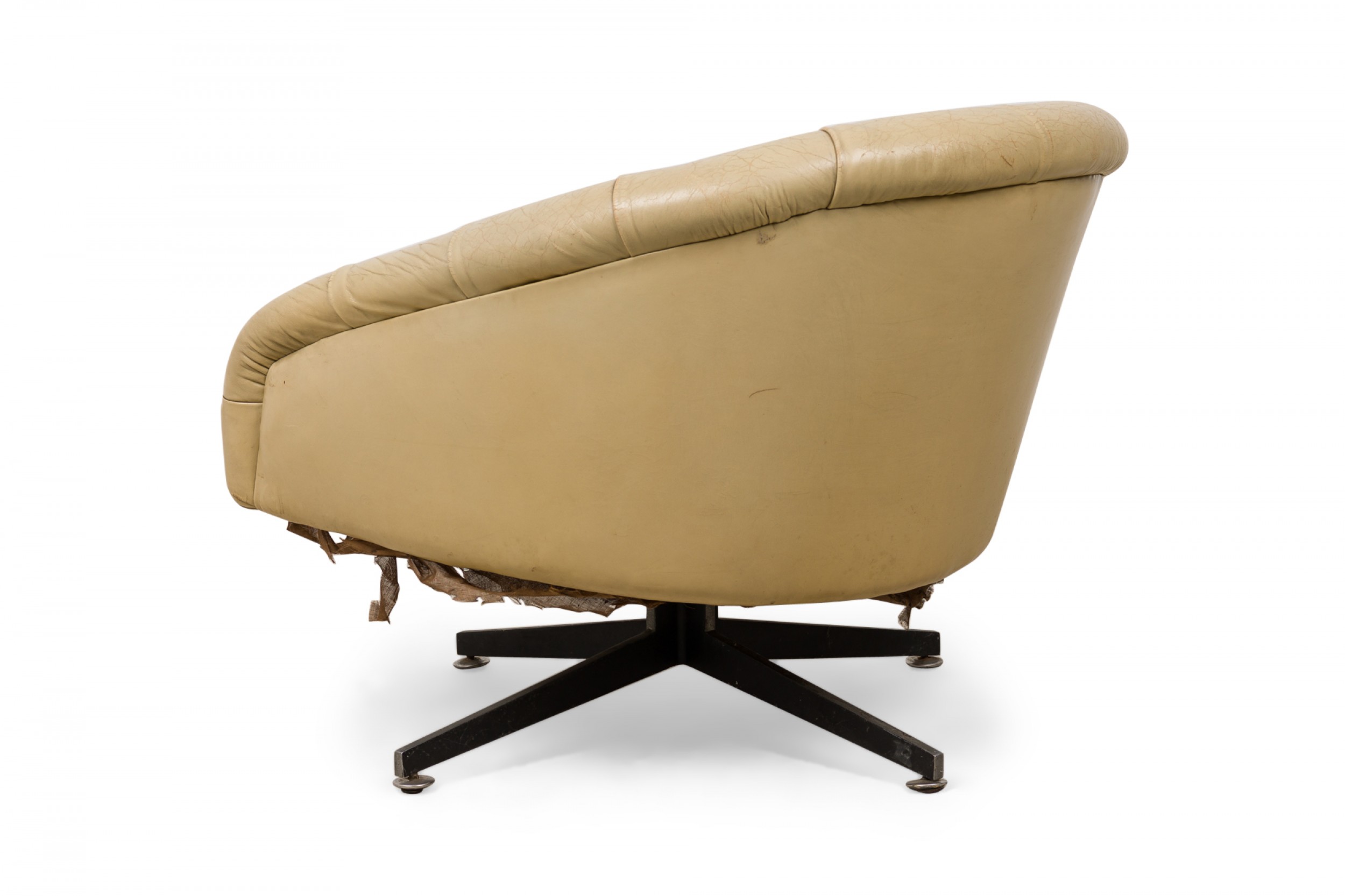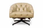 American Mid-Century tub-form swiveling lounge / armchair with beige button tufted leather upholstery, resting on a four leg brushed chrome pedestal base. (WARD BENNETT)