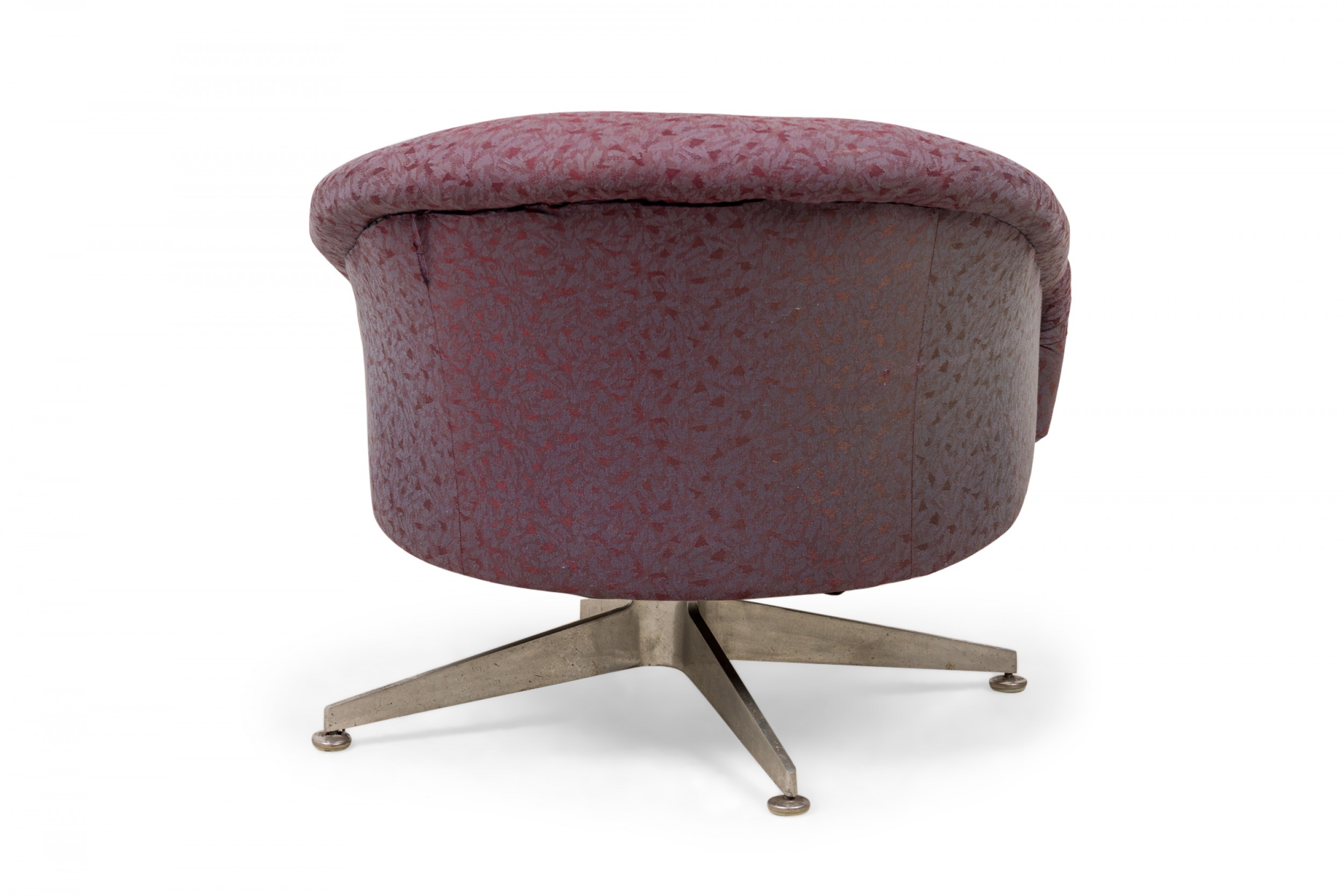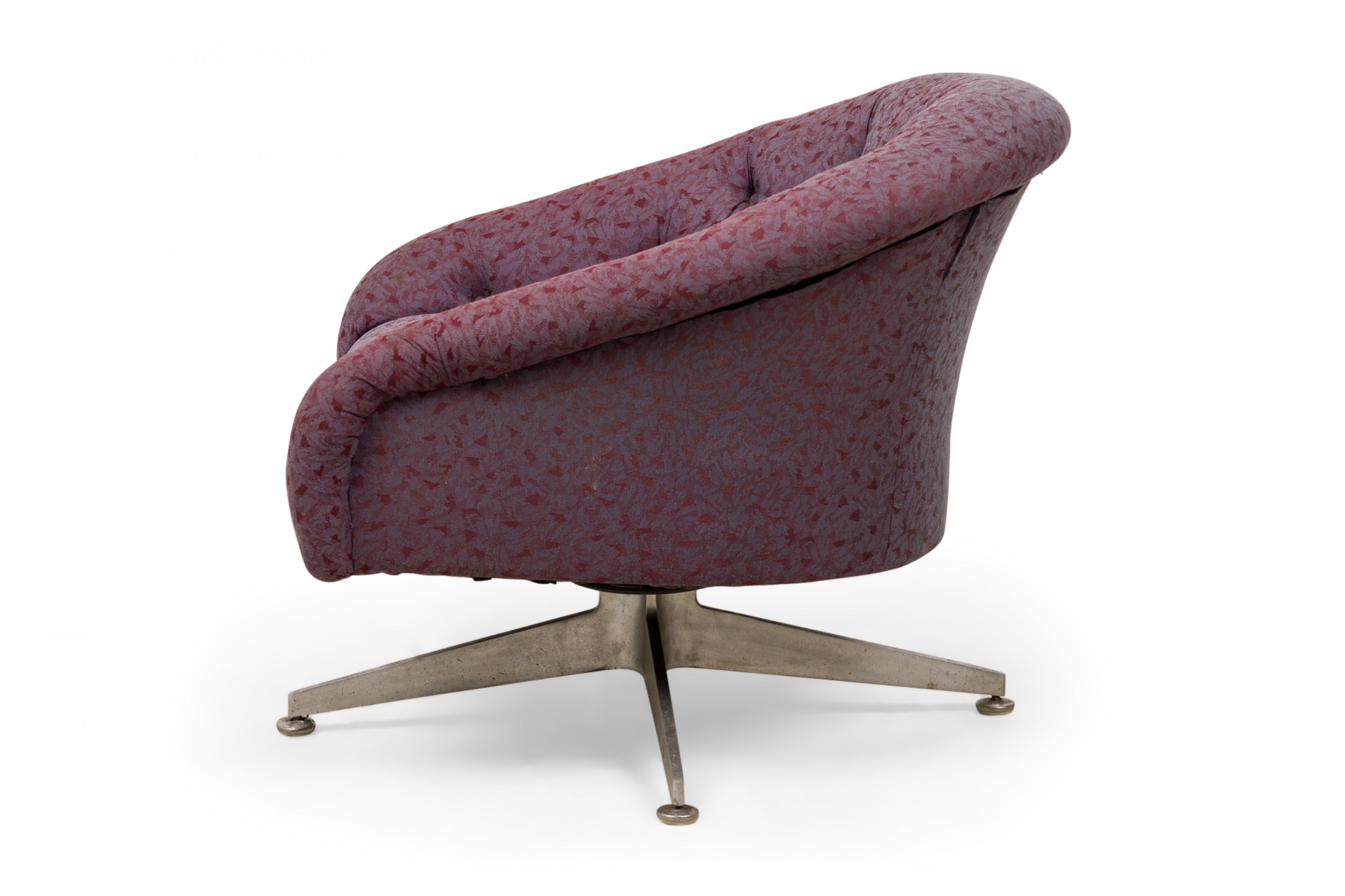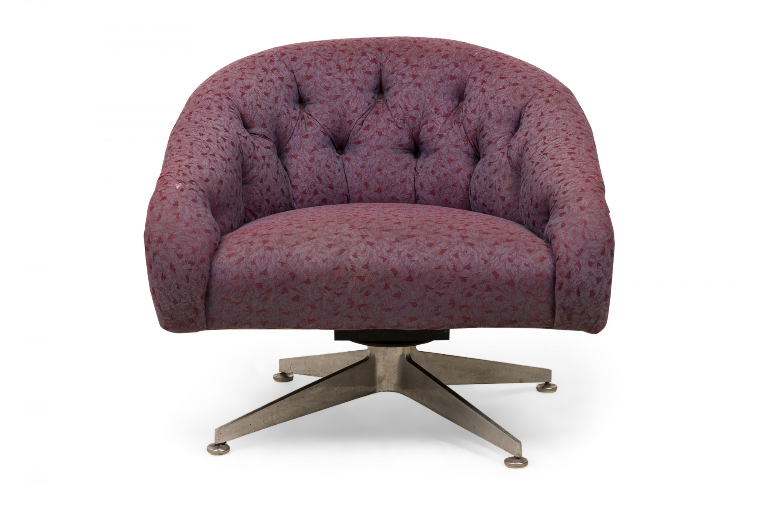 American Mid-Century tub-form swiveling lounge / armchair with lightly patterned purple button tufted fabric upholstery, resting on a four leg brushed chrome pedestal base. (WARD BENNETT)