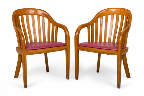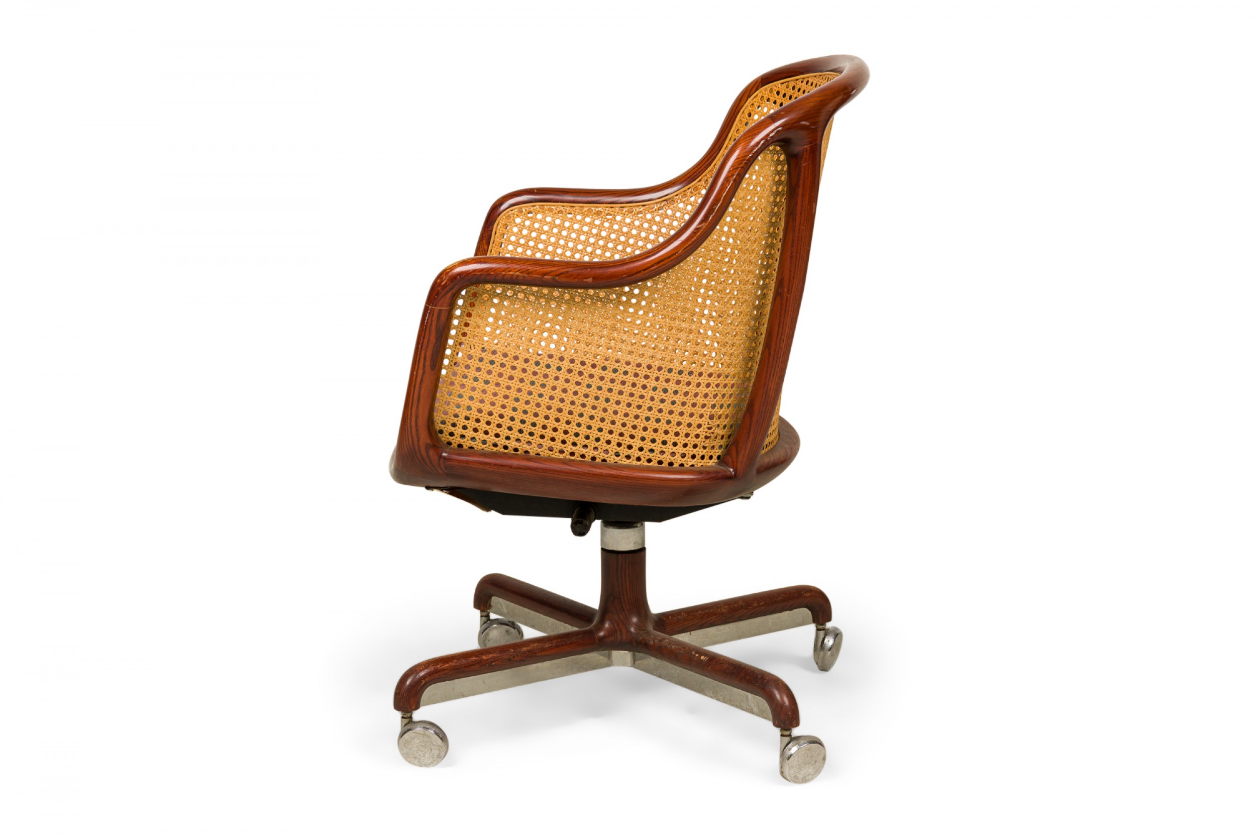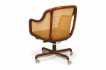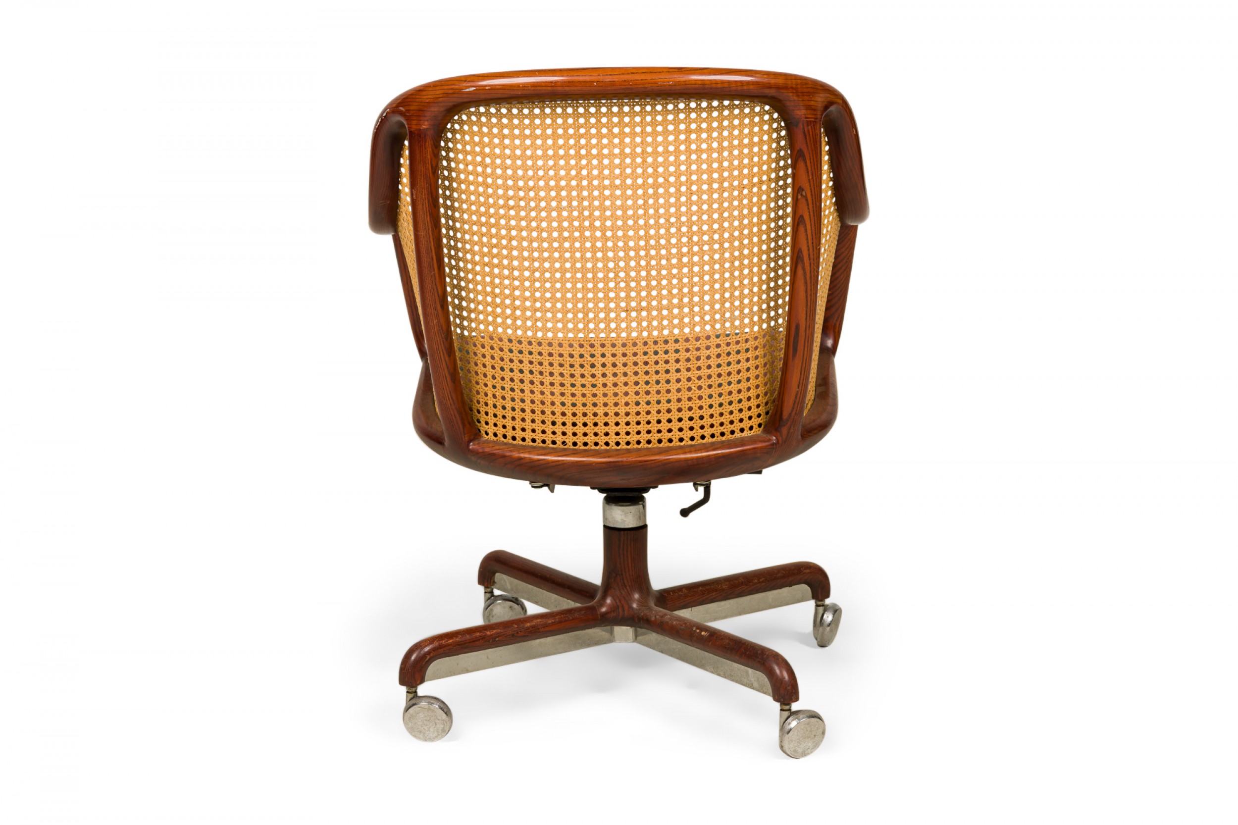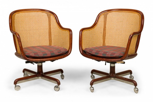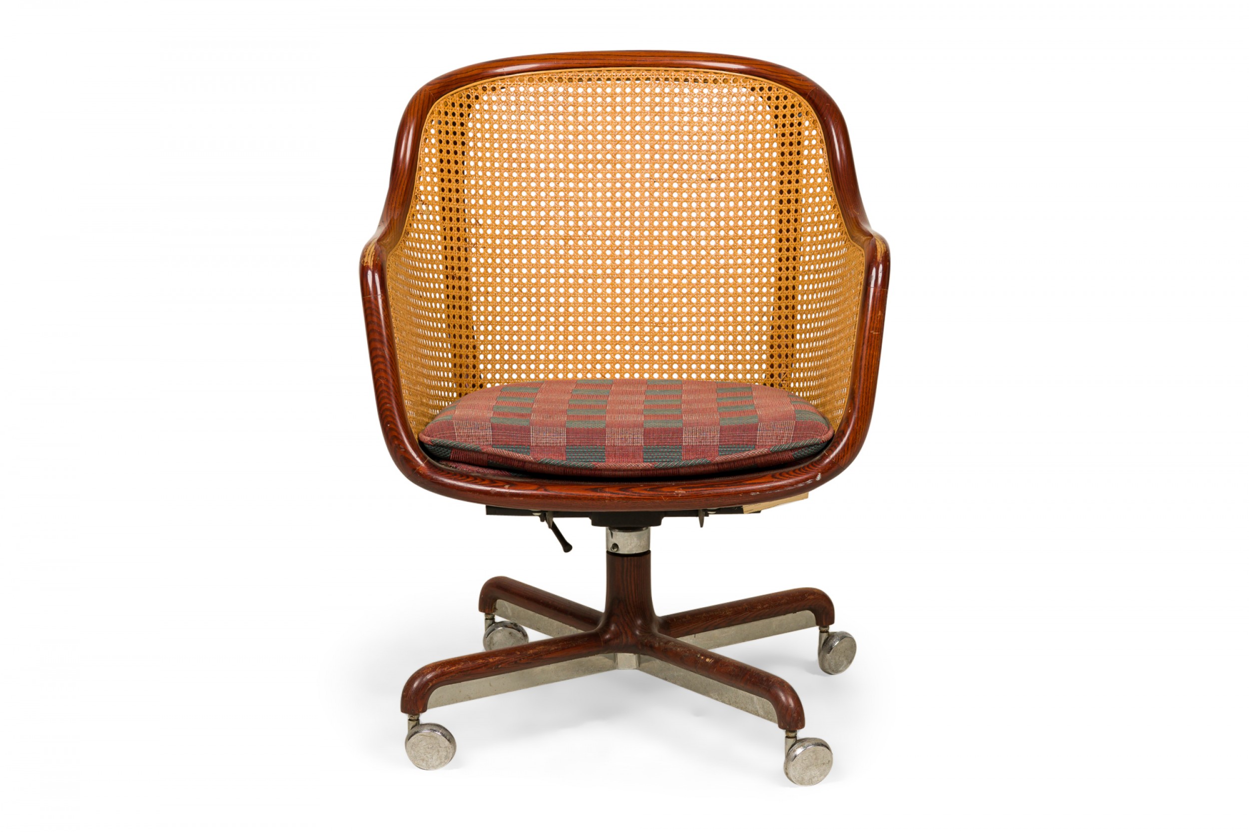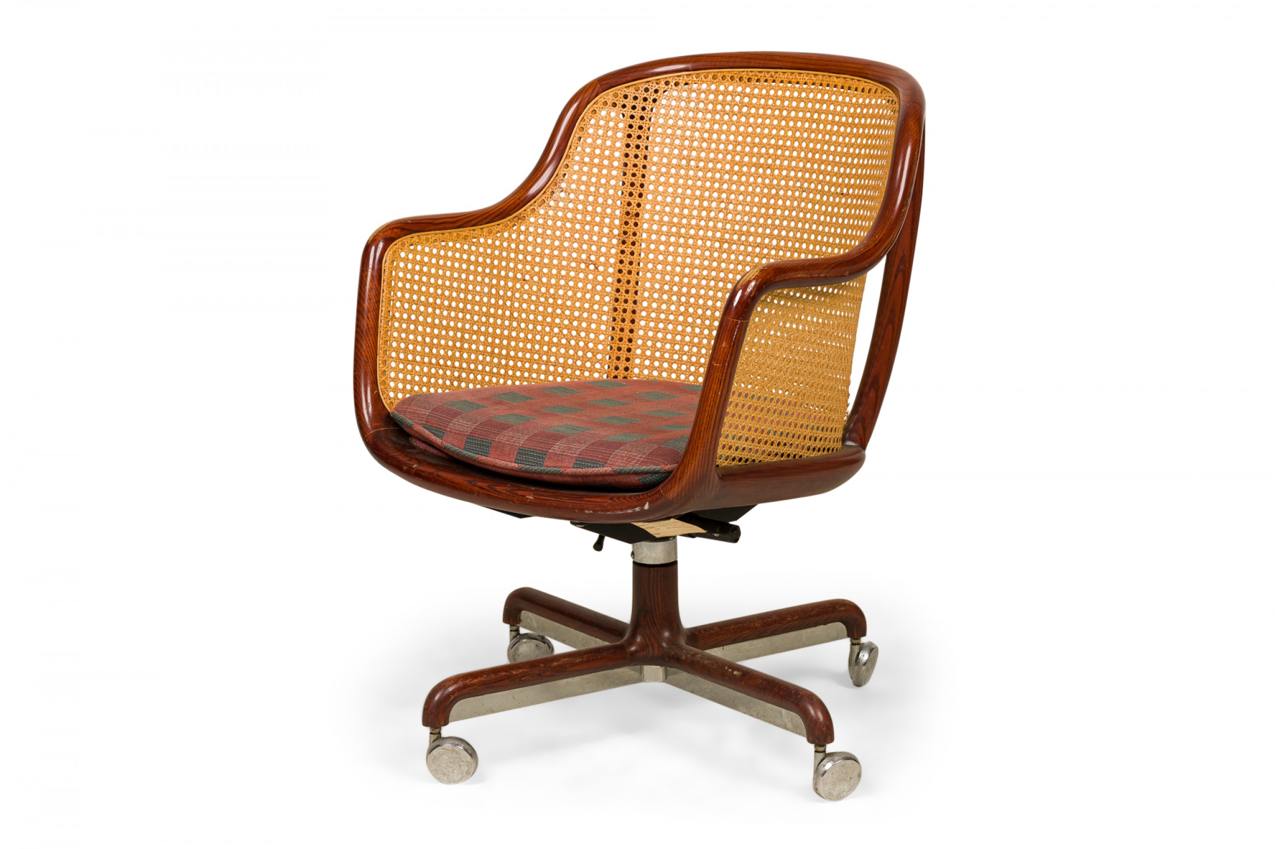 SET of 8 American Mid-Century swiveling office / conference armchairs with an ash bentwood frame, caned sides and backs, and a blue and red plaid seat cushion, resting on a four leg silver metal and wood trim base on four silver metal casters. (WARD BENNETT FOR BRICKEL ASSOCIATES)