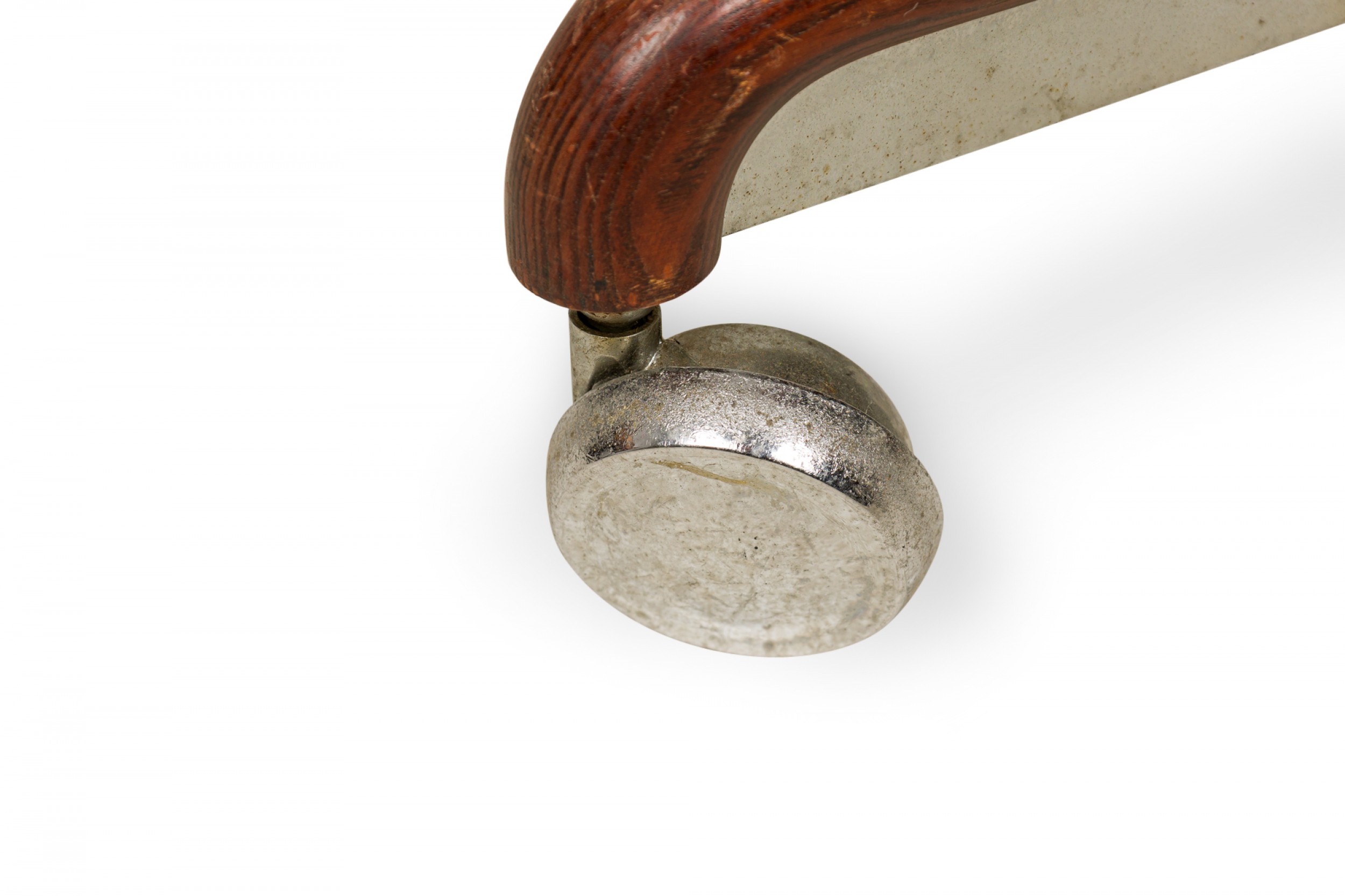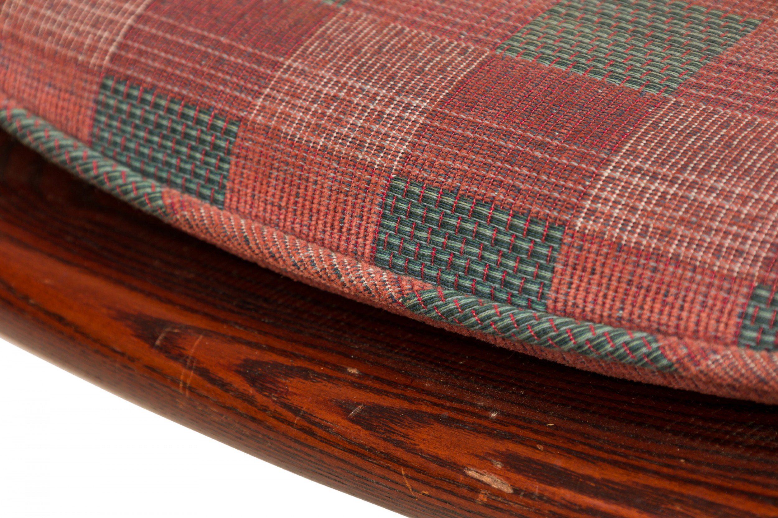 SET of 8 American Mid-Century swiveling office / conference armchairs with an ash bentwood frame, caned sides and backs, and a blue and red plaid seat cushion, resting on a four leg silver metal and wood trim base on four silver metal casters. (WARD BENNETT FOR BRICKEL ASSOCIATES).