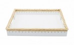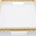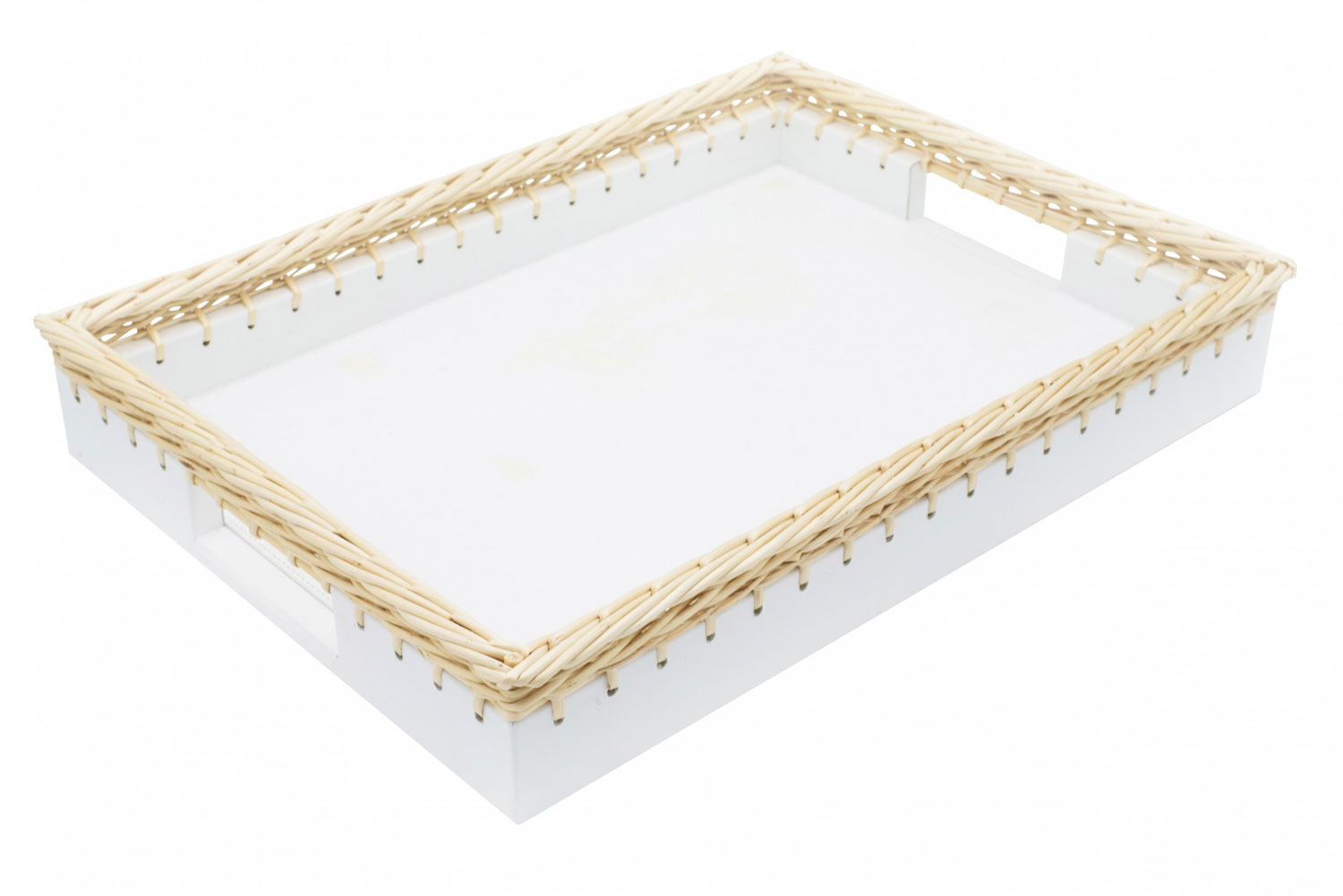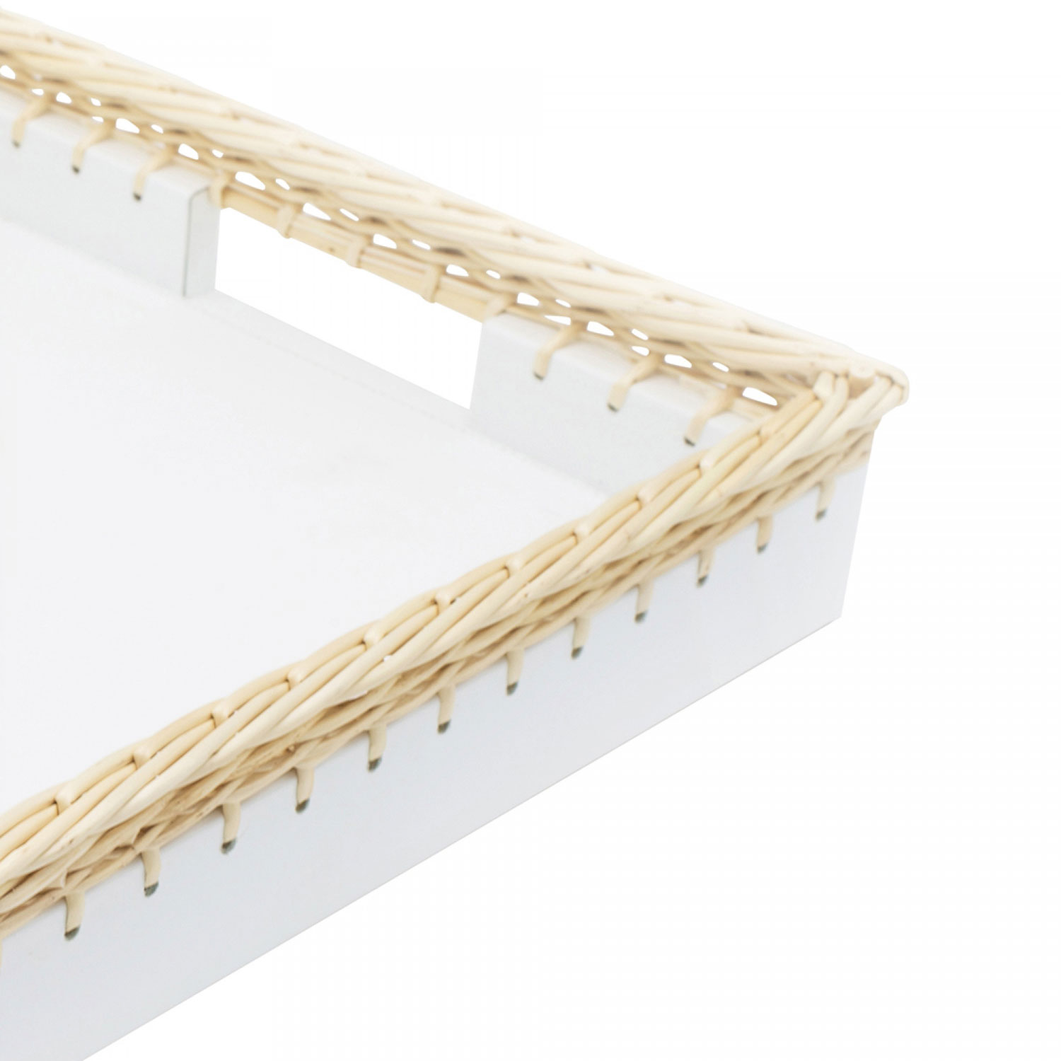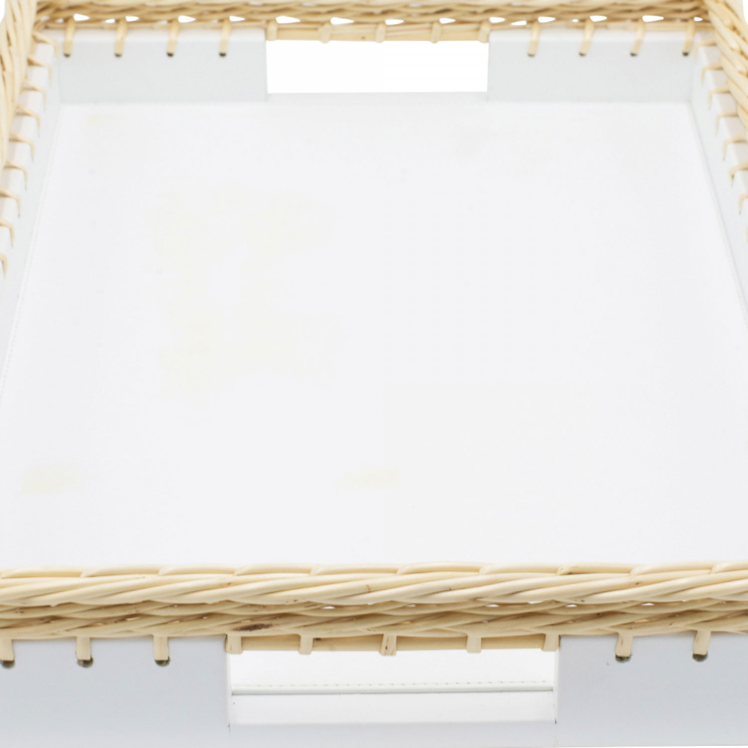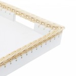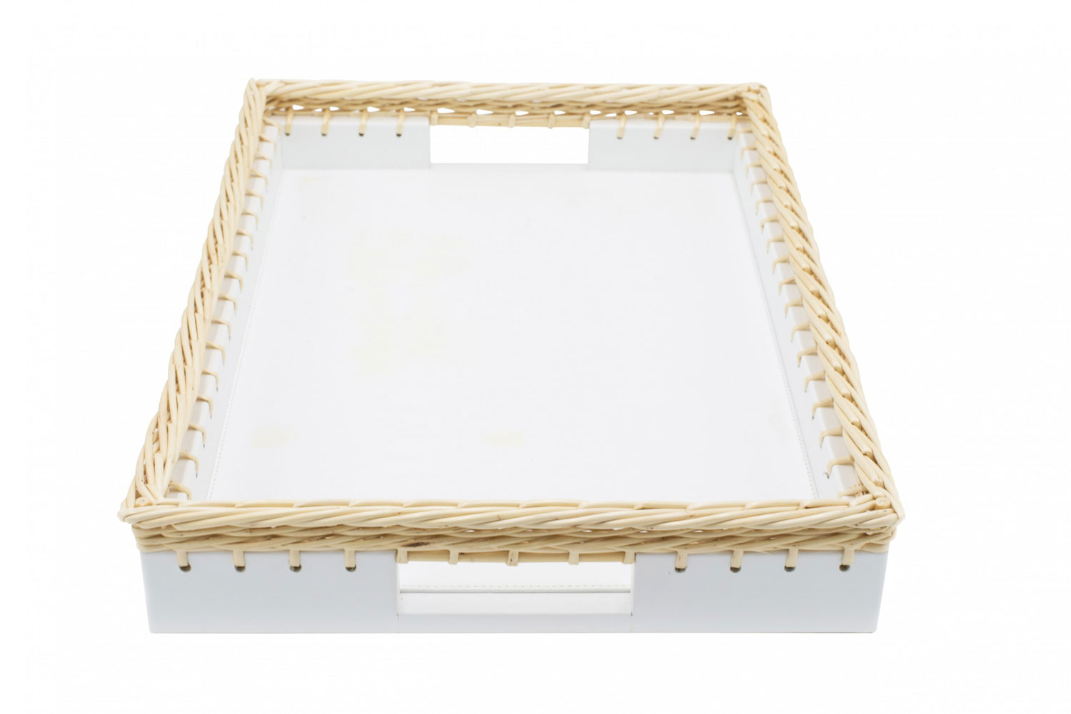 Contemporary rectangular white leather tray with a woven wicker willow wood edge (Made in Italy) (Related item: MOD022)