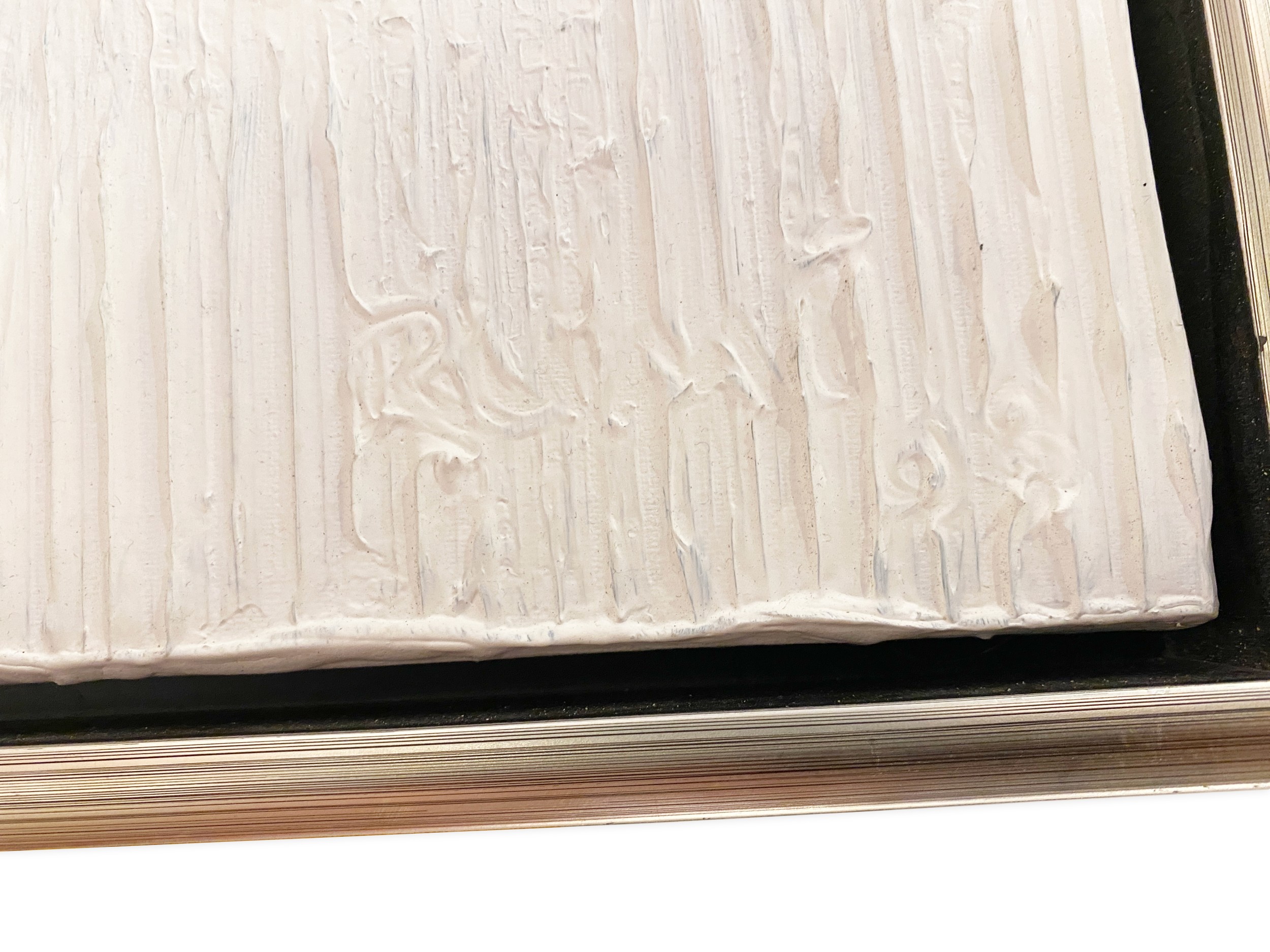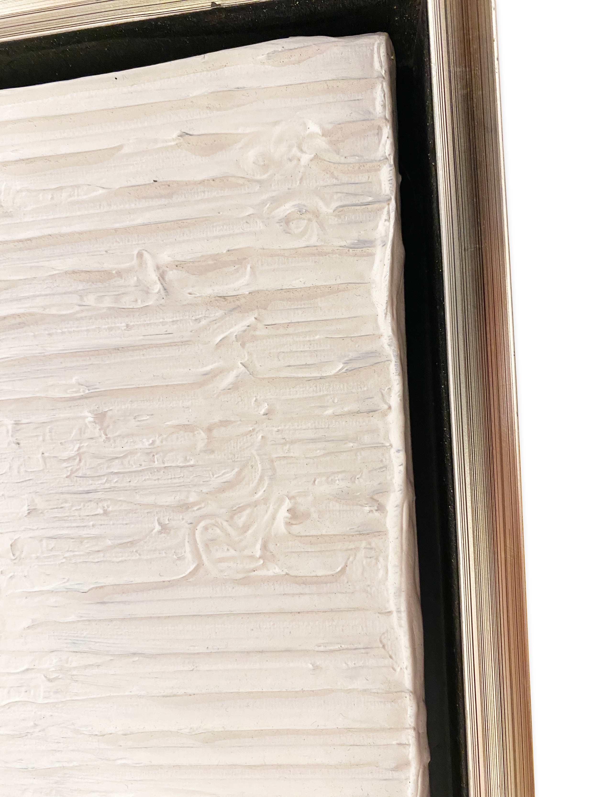Contemporary oil on canvas painting depicting a ridge textured abstract composition in white with a grey underpainting in a silver leaf frame (RICARDO RUMI)