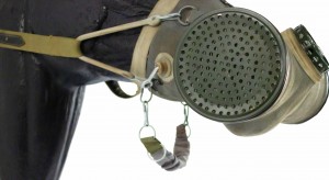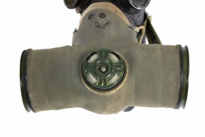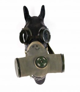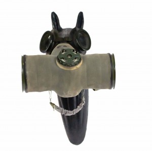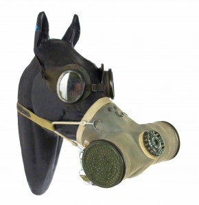 WWI model of a molded papier-mache brown horse head wearing a gas mask and goggles. (Can be mounted on back).