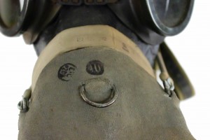 WWI model of a molded papier-mache brown horse head wearing a gas mask and goggles. (Can be mounted on back)..